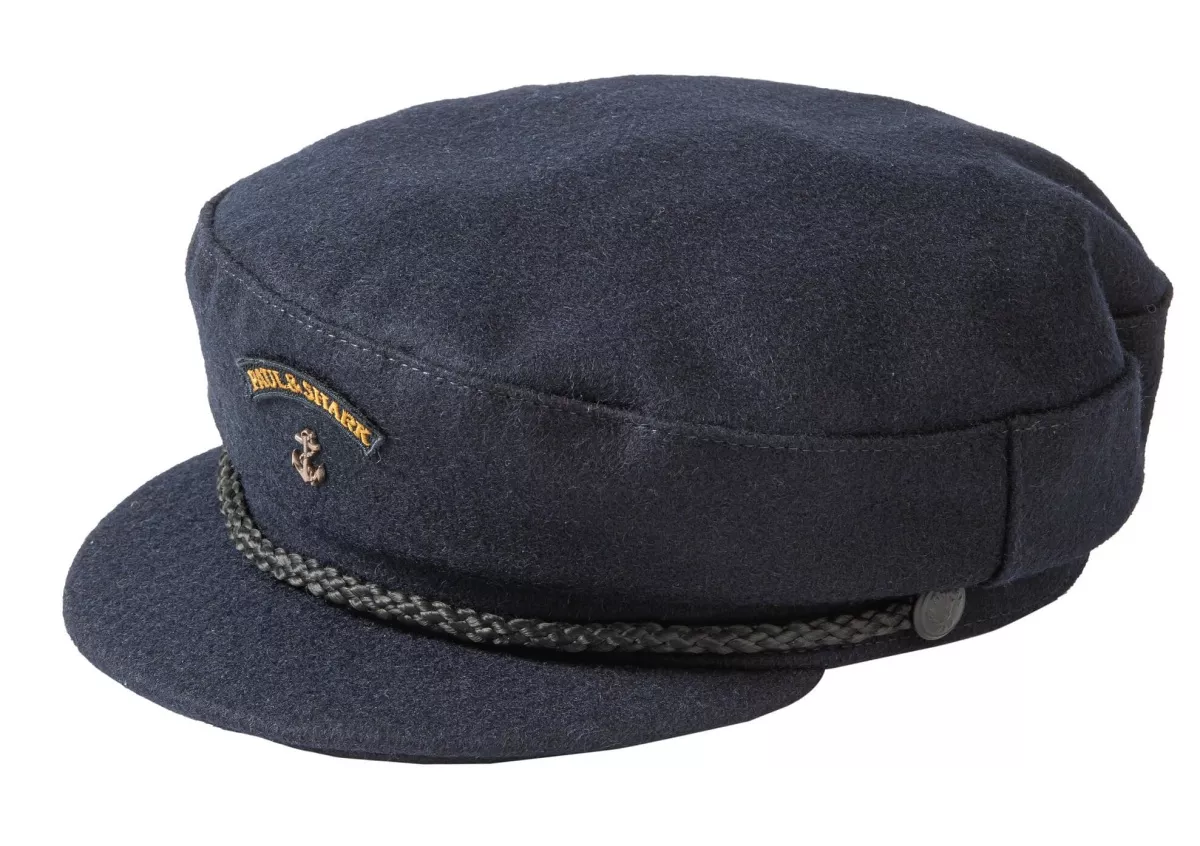 Фуражка из смесовой шерсти с прямым козырьком. Прочный нейлон в состав материала позволяет лучше сохранять форму изделия. Спереди модель украшены однотонным плетеным шнуром, нашивкой с логотипом бренда и миниатюрным бронзовым якорем. Сзади — вышитой бежевыми нитями надписью «Bretagne»