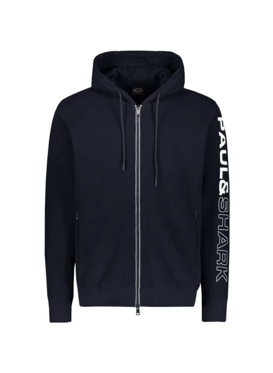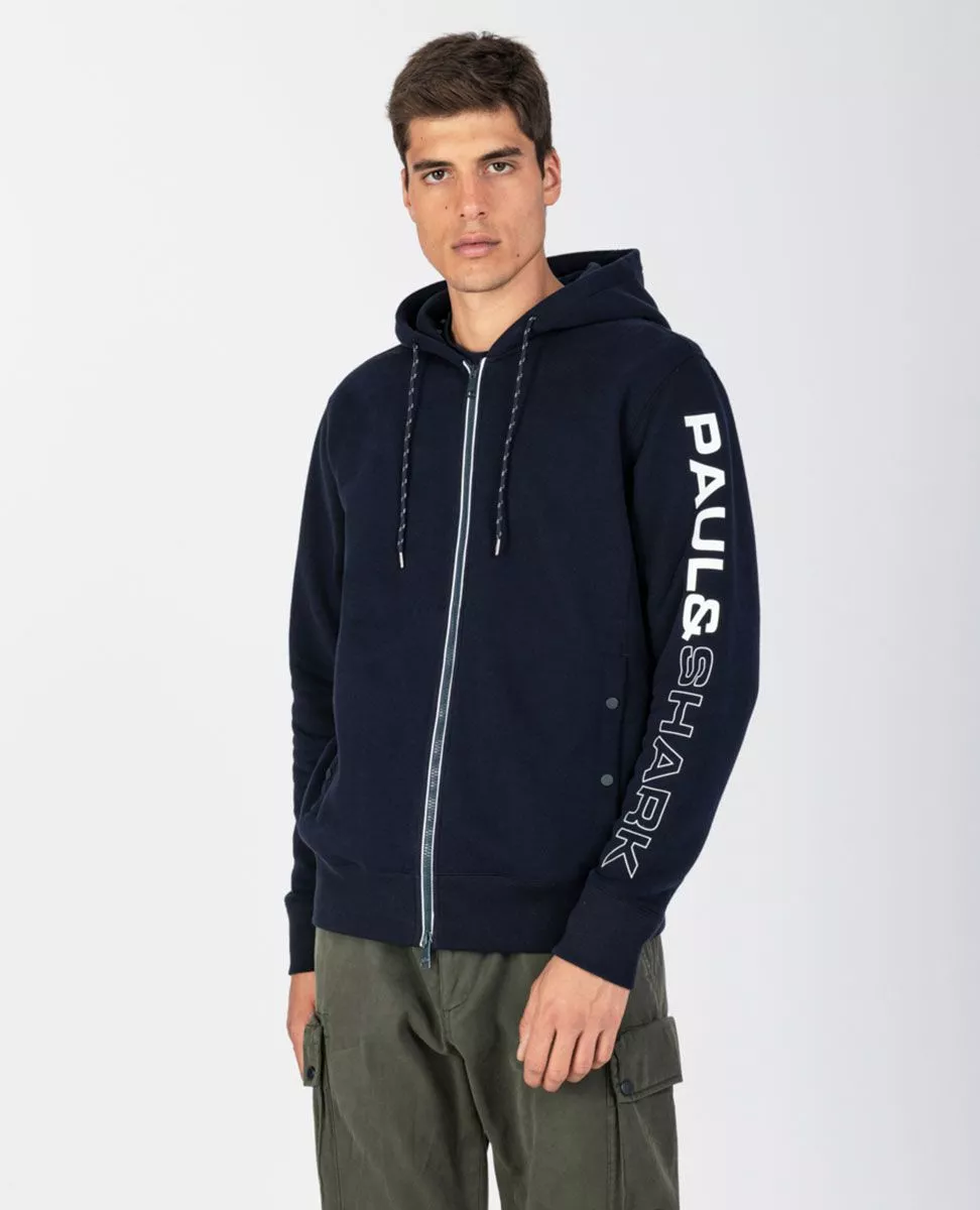 Хлопковая спортивная куртка на молнии из теплого флиса на основе органического хлопка. Двусторонняя застежка-молния, боковые карманы, капюшон. Манжеты и нижний край в рубчик. Крупный белый принт на левом рукаве