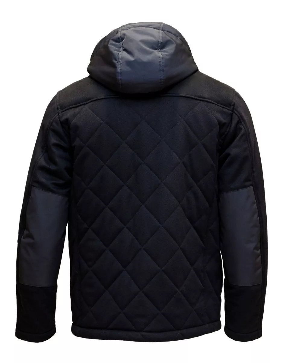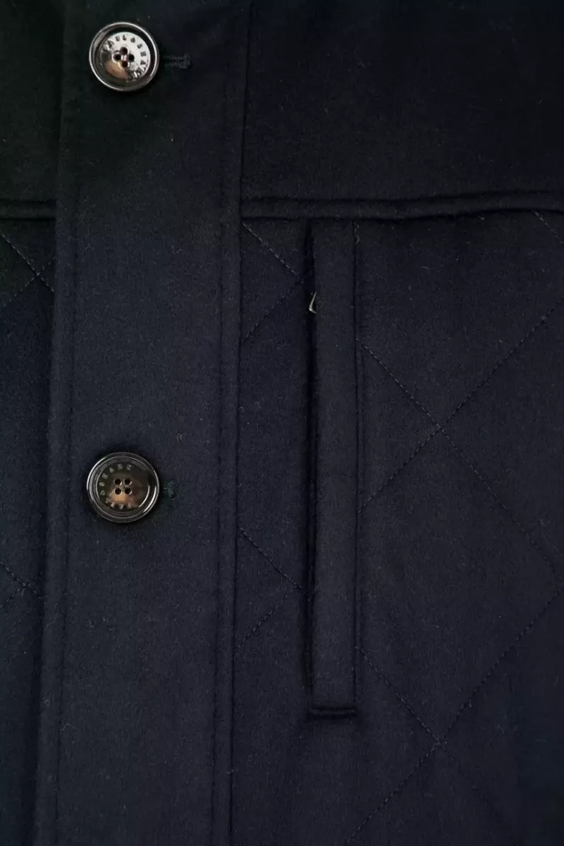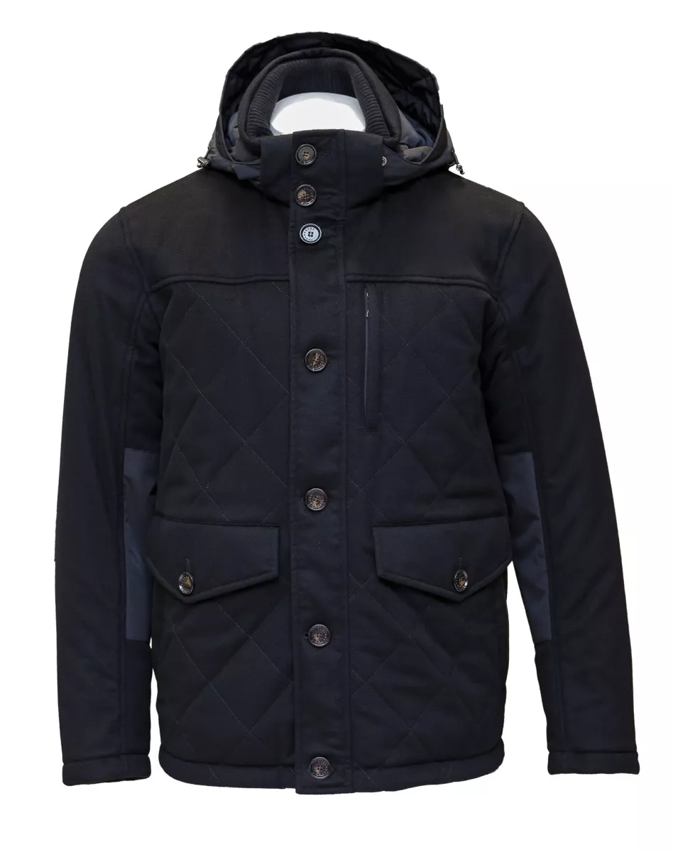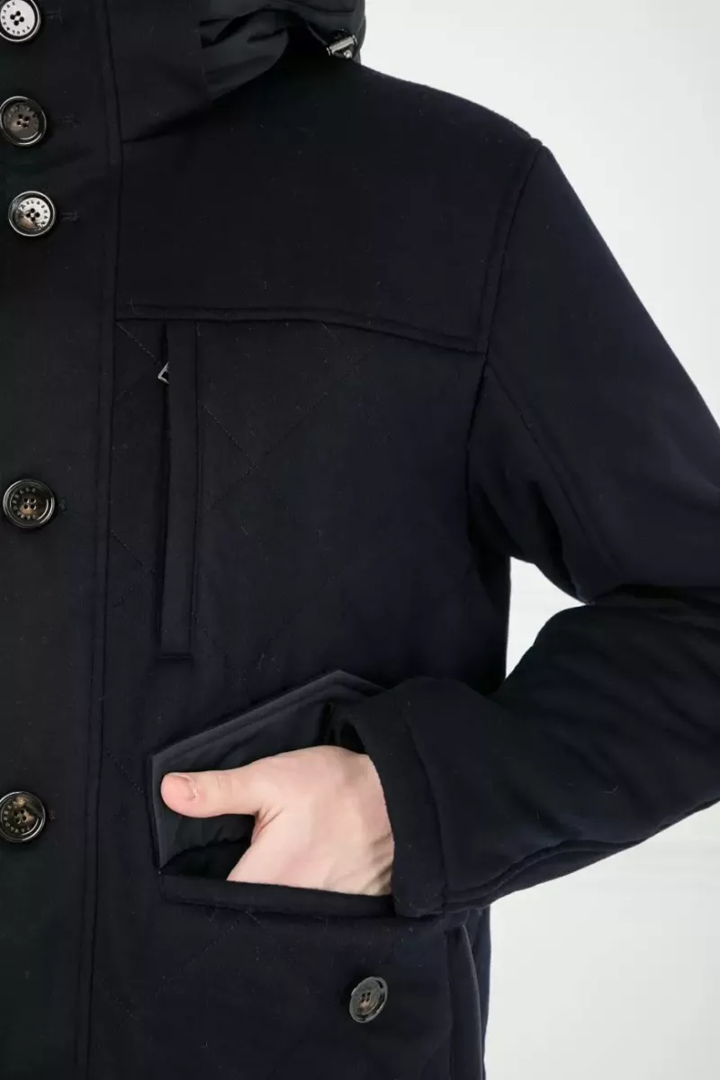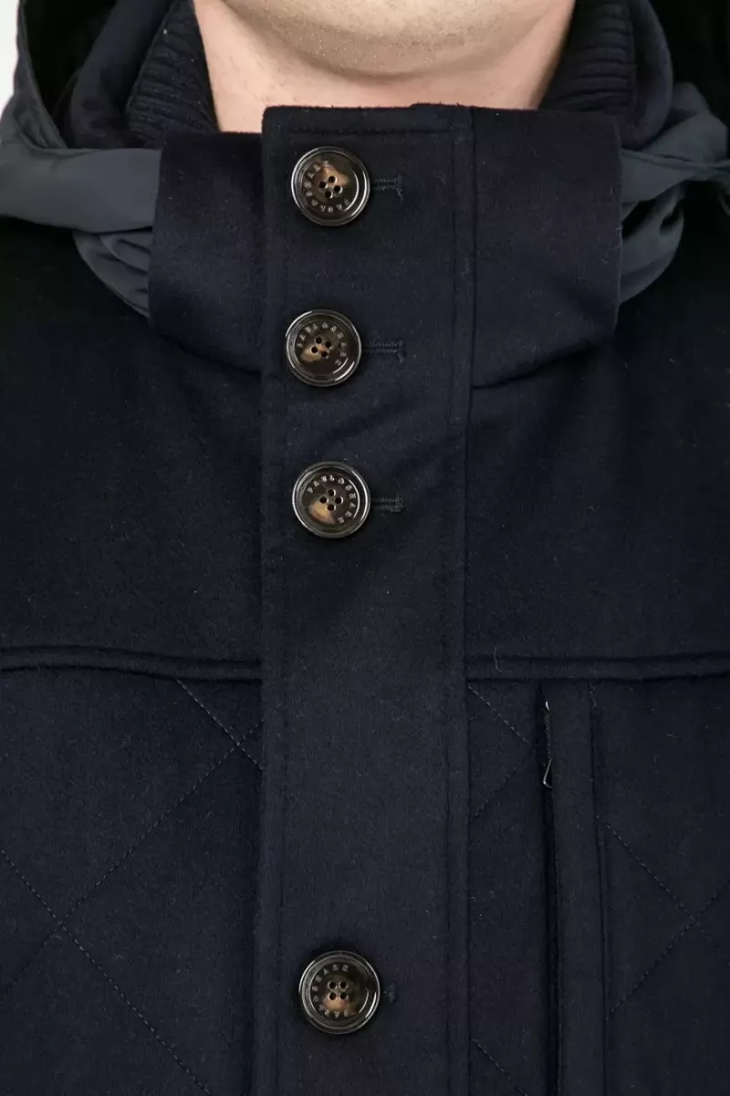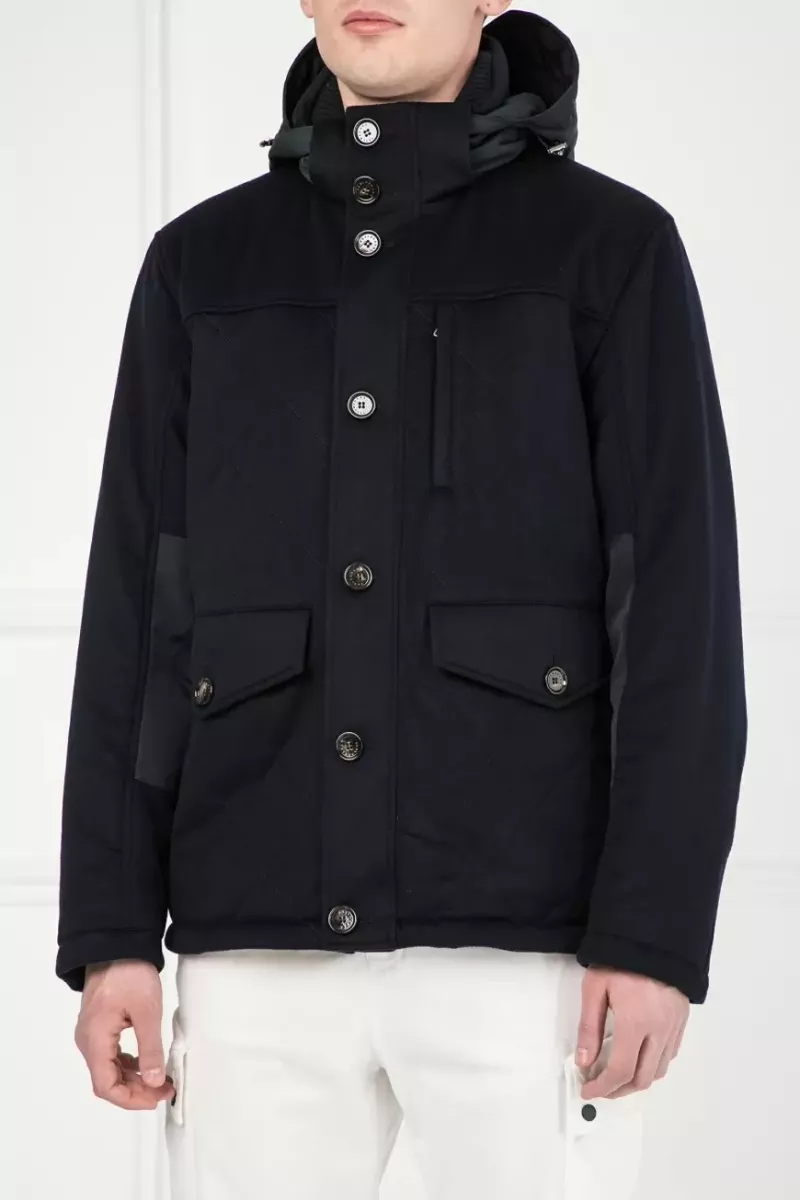 Мужская тёмно-синяя куртка Paul&Shark прямого кроя, выполненная из натурального кашемира. Съемный капюшон, двойная застёжка на молнию и пуговицы. Рукава с декоративными заплатками на локтях, прорезные карманы