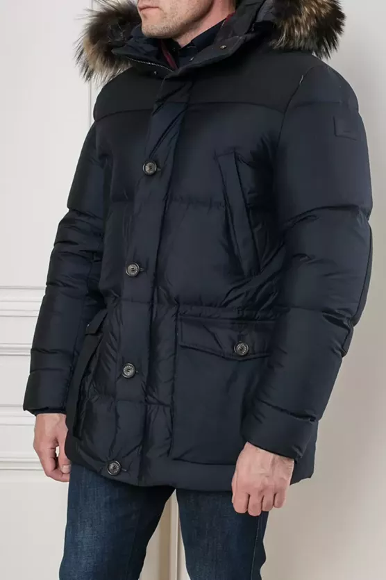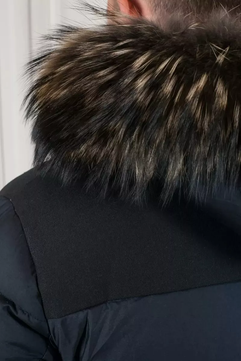 Удобный съемный капюшон на молнии с отделкой из натурального меха енота.