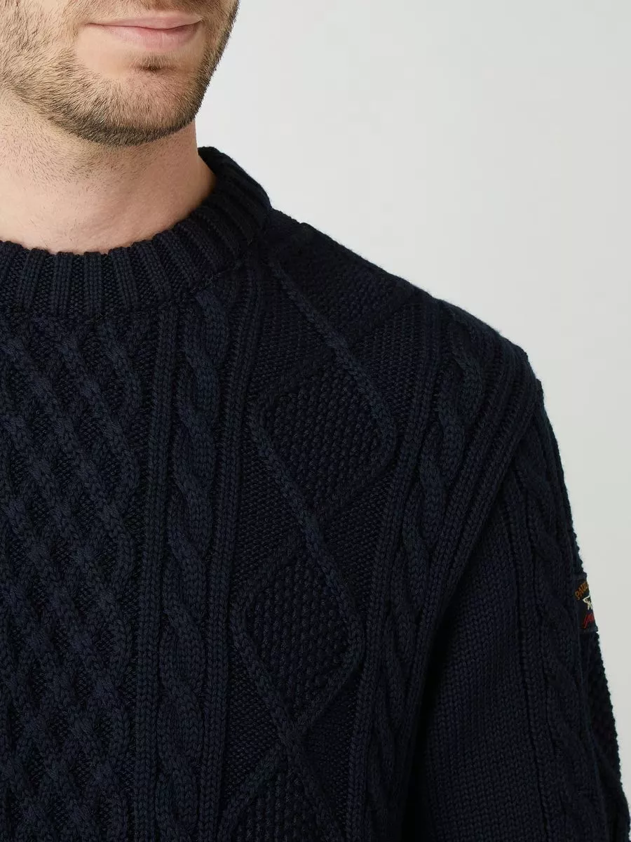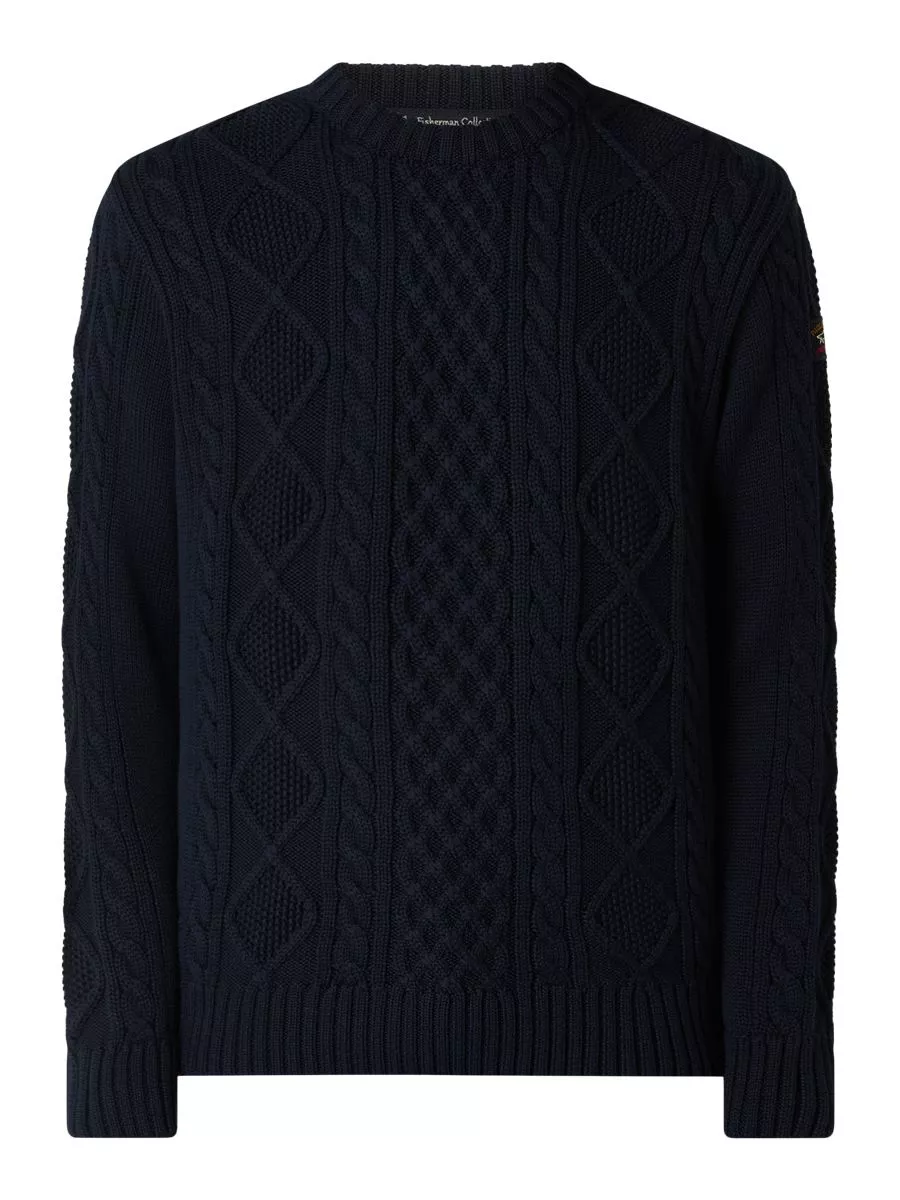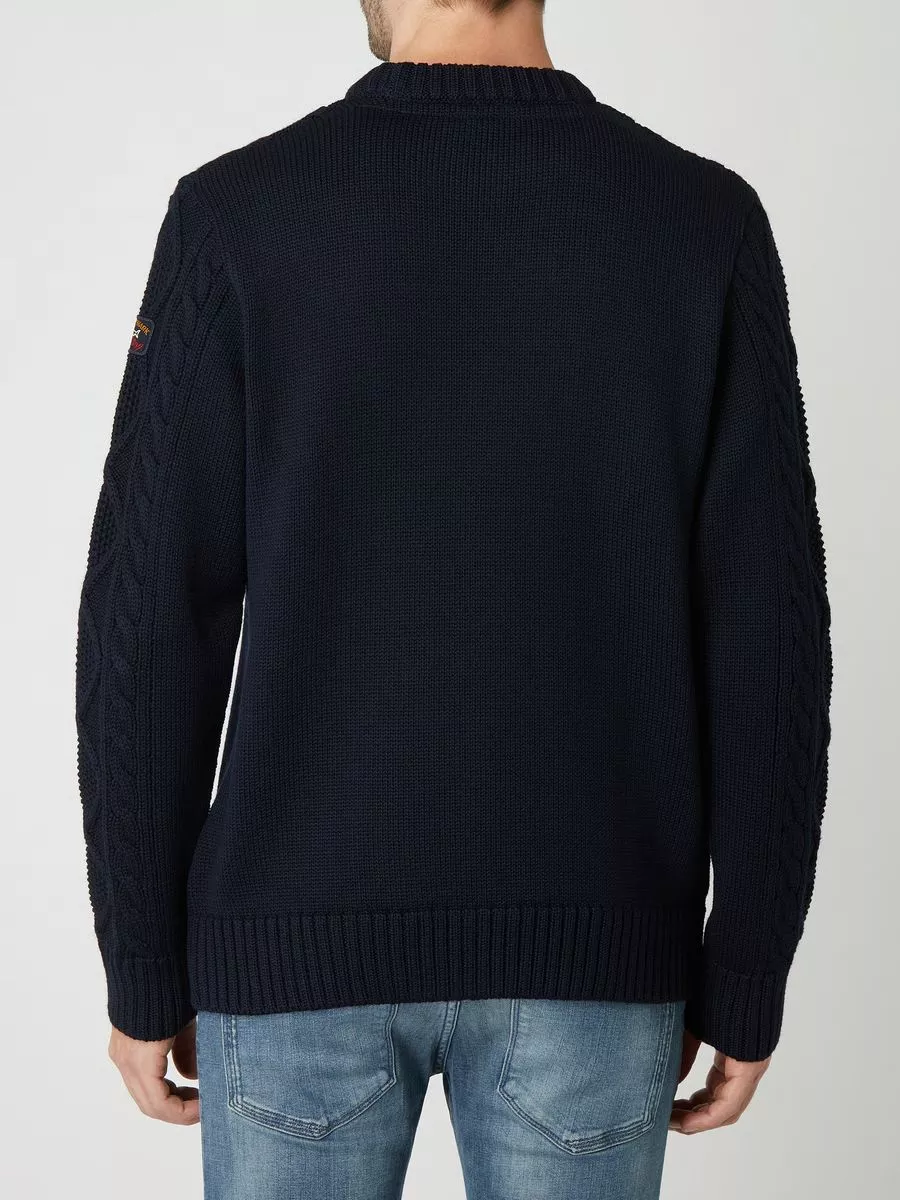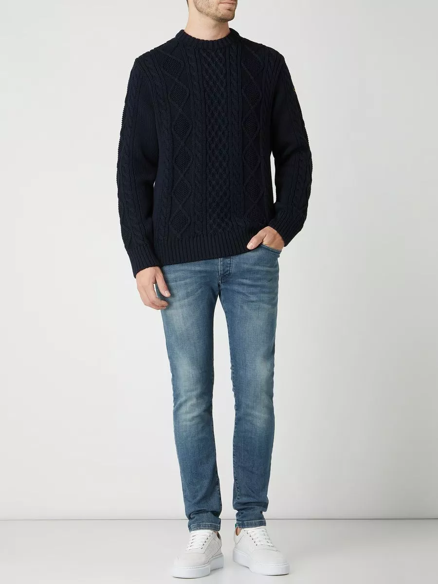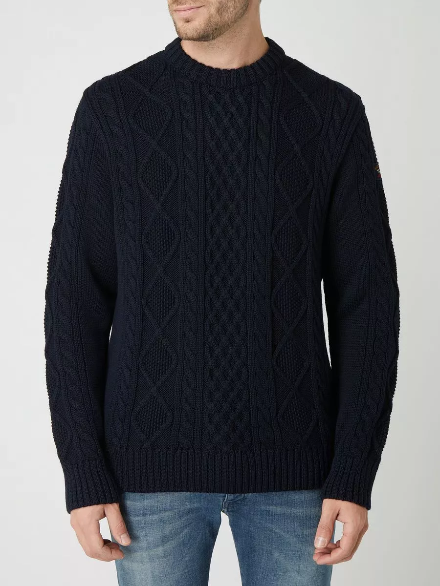Свитер изготовлен из легкой смеси натуральной шерсти. Свободной посадкой с тесьмой, круглым и ребристым вырезом, крупной вязки