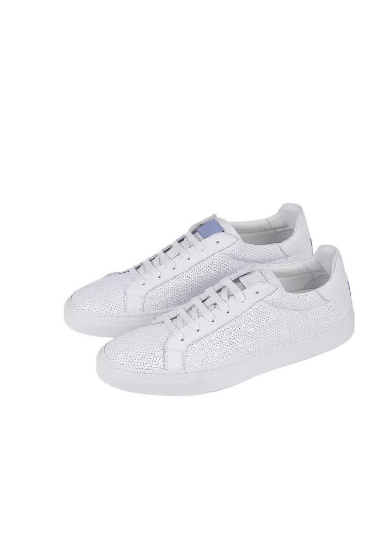 Белые кеды с перфорацией из гладкой матовой кожи. Материал отлично пропускает воздух, поэтому в обуви будет комфортно весь день. Широкая подошва прошита прочной нитью, чтобы изделие прослужило как можно дольше.