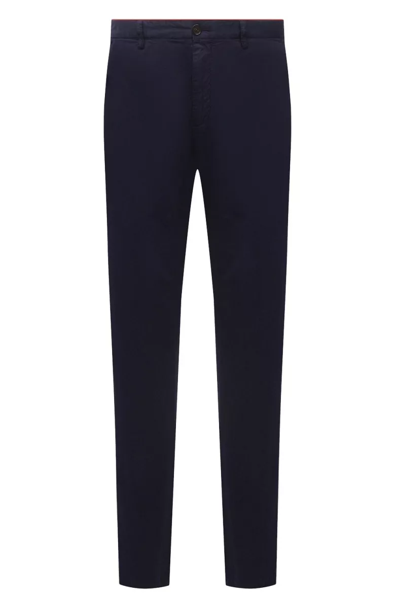 Чиносы универсального темно-синего цвета обладают достаточной степенью формальности, чтобы вписаться в образ для офиса с нестрогим дресс-кодом. Для пошива использовали мягкий тонкий хлопок. Отборные гладкие волокна переплели особенно плотно, поэтому брюки выглядят так, словно их выполнили из шелка
