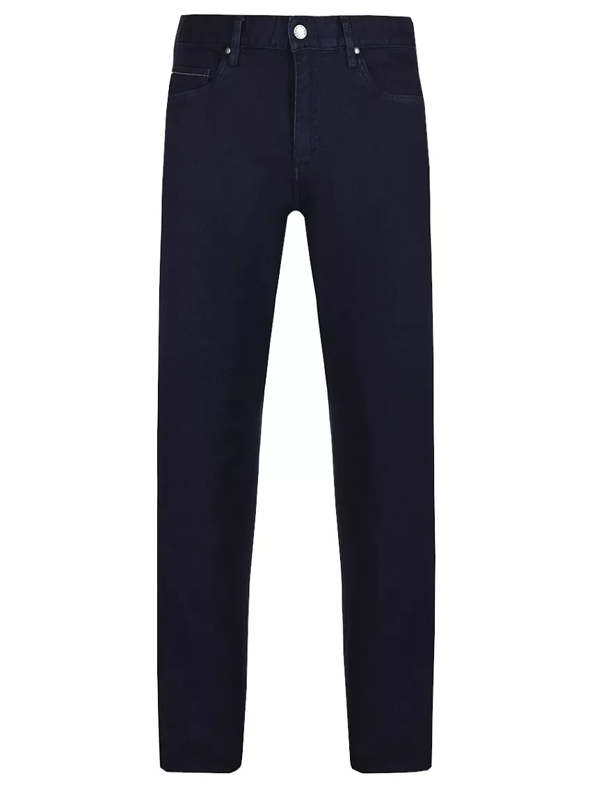 Темно-синие джинсы из хлопка средней посадки со шлевками на поясе. Прорезные и накладные карманы, застежка-молния и пуговица, фирменный лейбл и вышитый логотип