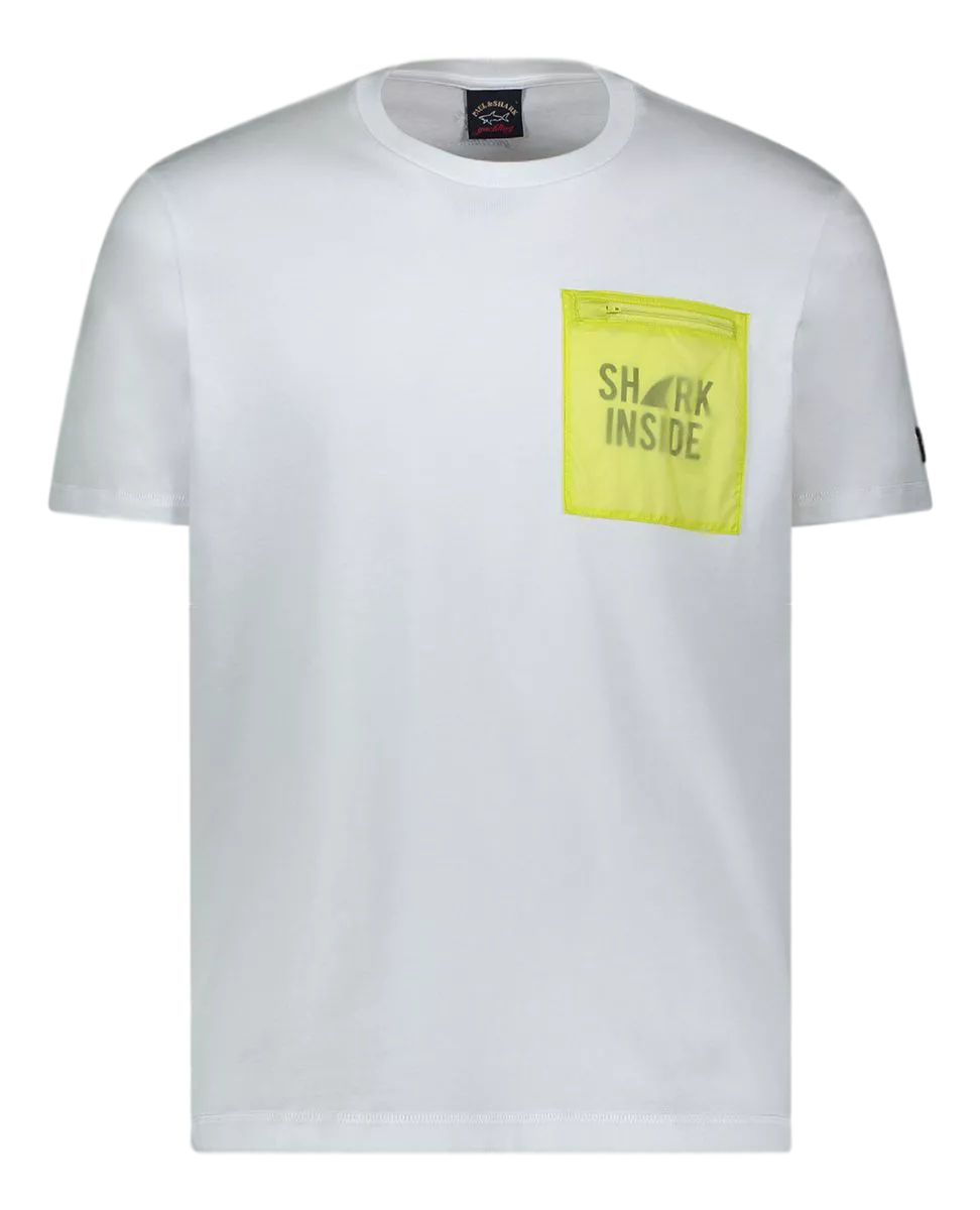 Белая футболка с коротким рукавом и контрастным карманом спереди. Надпись SHARK INSIDE и молния на кармане.