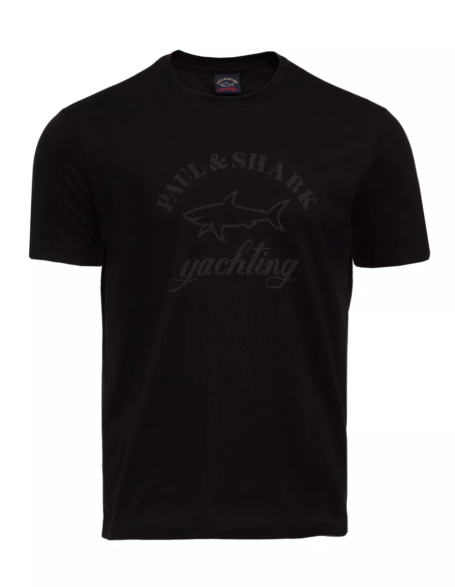Черная футболка из органического хлопка со светоотражающим принтом в виде логотипа. Прямой крой, круглый вырез горловины, короткие рукава