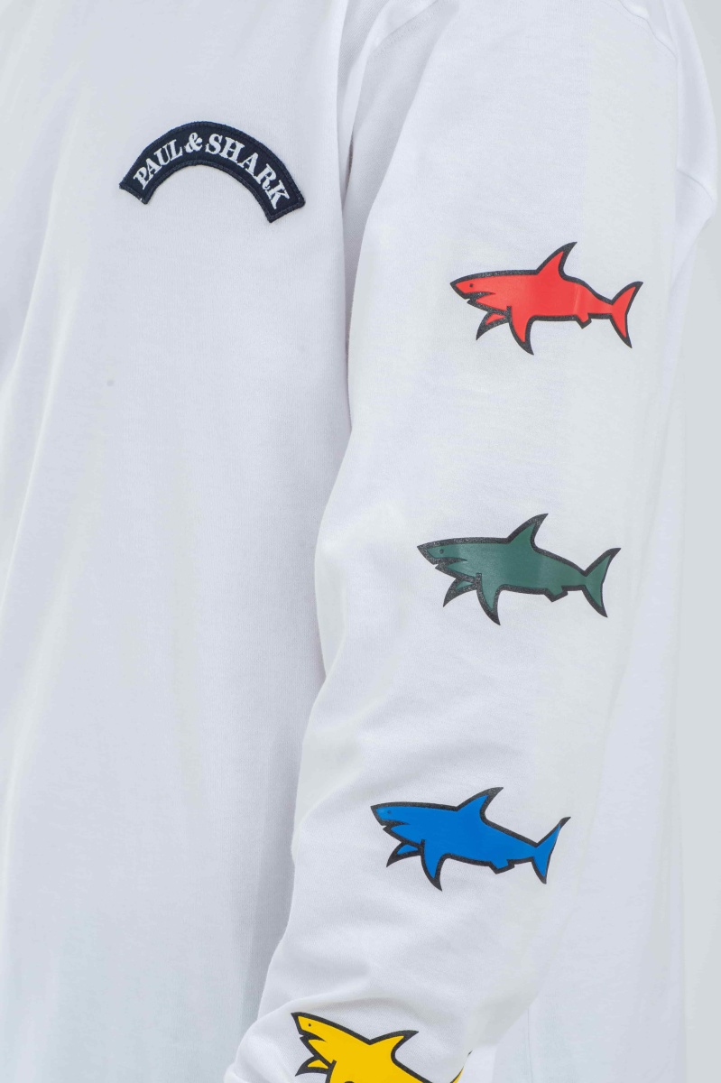 Футболка с длинным рукавом, модель оверсайз. Спущенная линия плеча. На рукавах и спине детали в виде цветных акул. 100% органический хлопок.