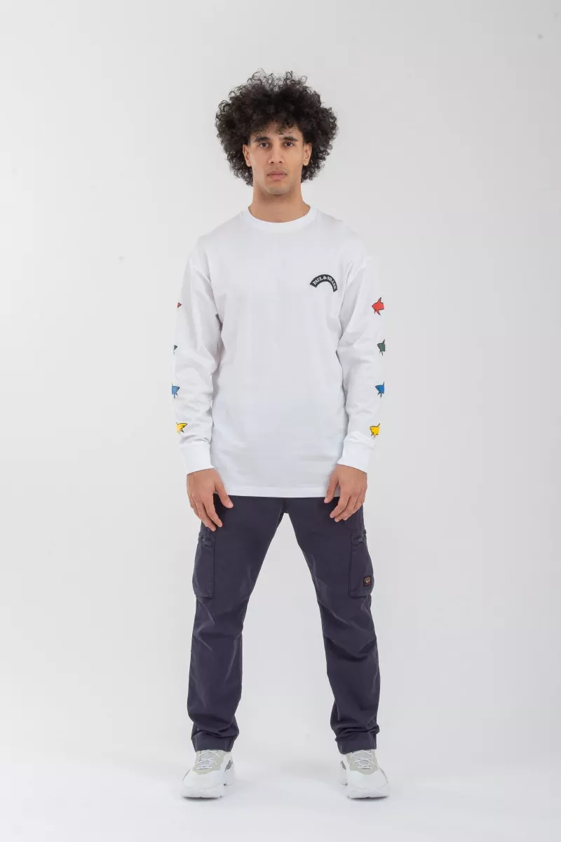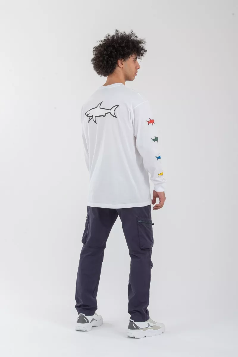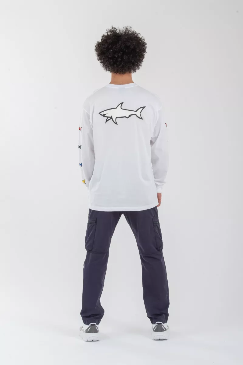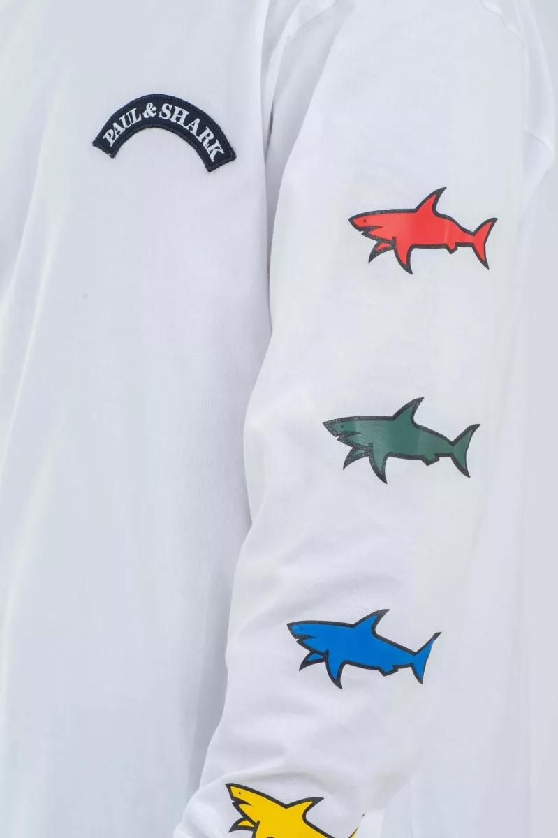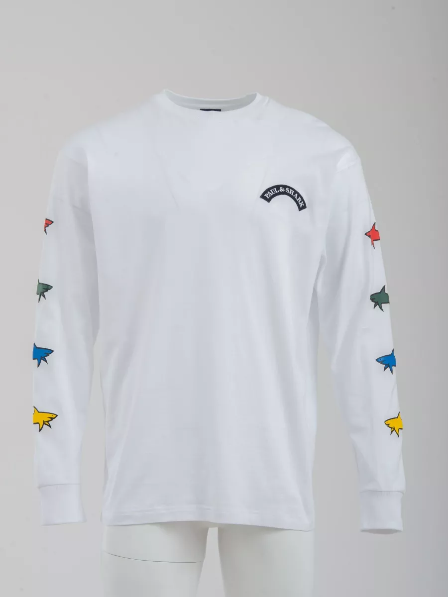Футболка с длинным рукавом, модель оверсайз. Спущенная линия плеча. На рукавах и спине детали в виде цветных акул. 100% органический хлопок.