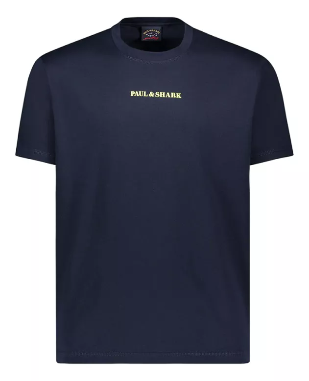 Темно-синяя футболка с яркой контрастной фирменной надписью на груди. Нашивка на левом плече. В изделии из легкого хлопка будет комфортно в течение всего дня