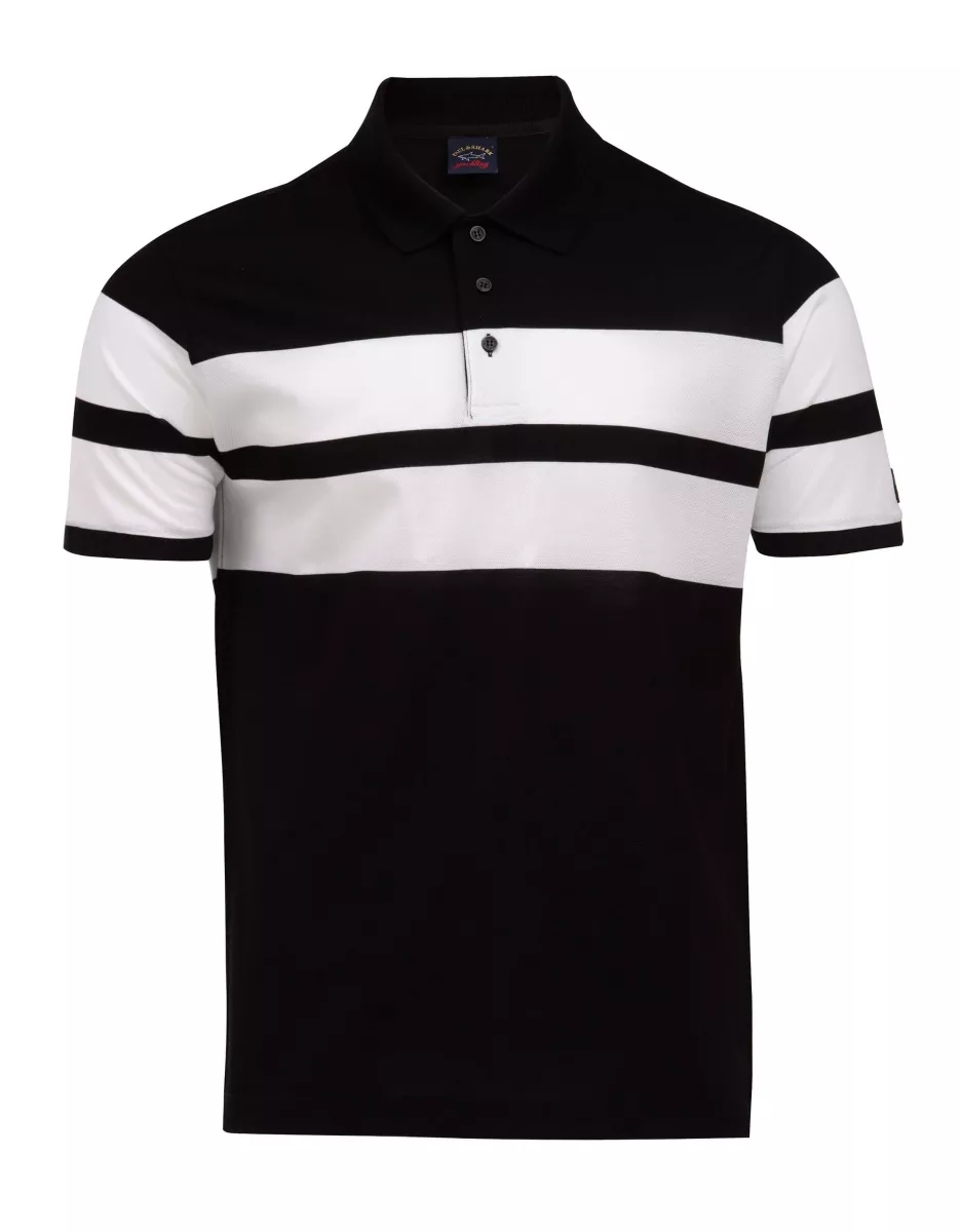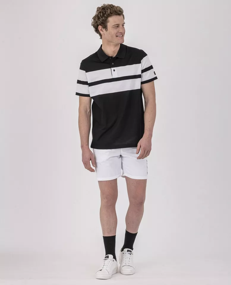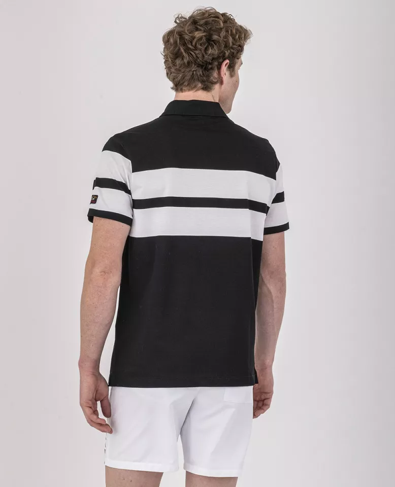 Хлопковое поло с крупными контрастными полосами. Воротник на 3 пуговицах, лого на левом рукаве