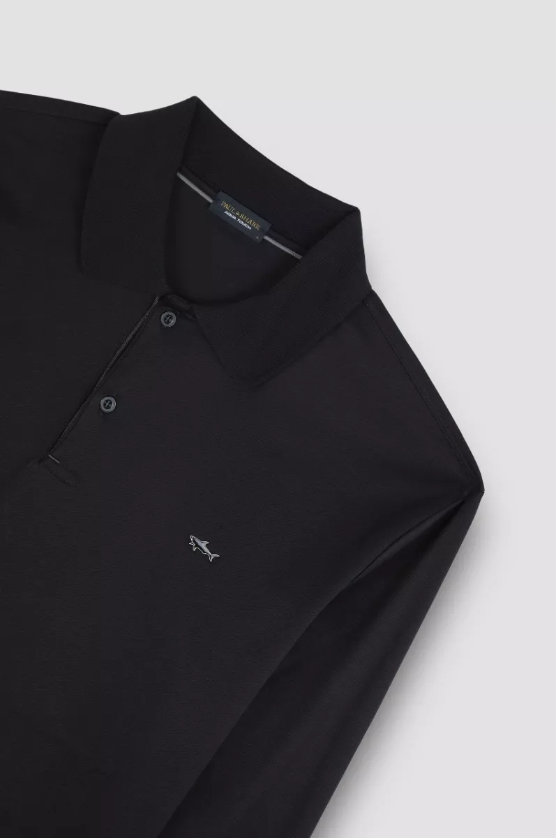 Поло изготовлено из хлопка Aqua Touch: изысканной органической египетской хлопчатобумажной ткани с мягким, водостойким переплетением. Украшена модель металлической акулой на груди для придания морского фирменного стиля