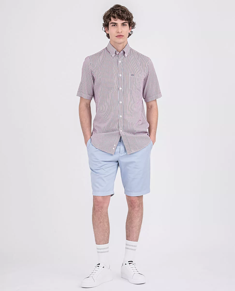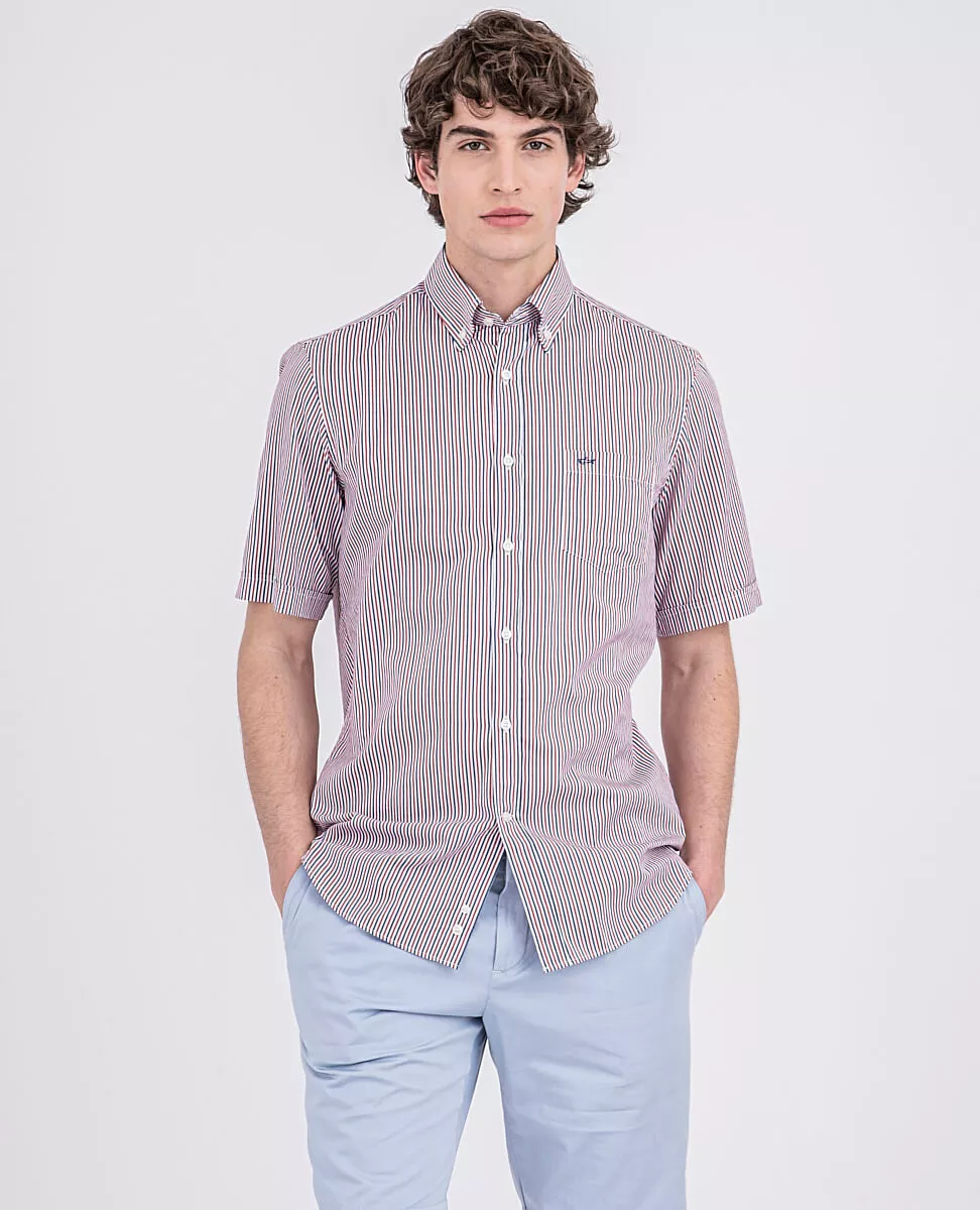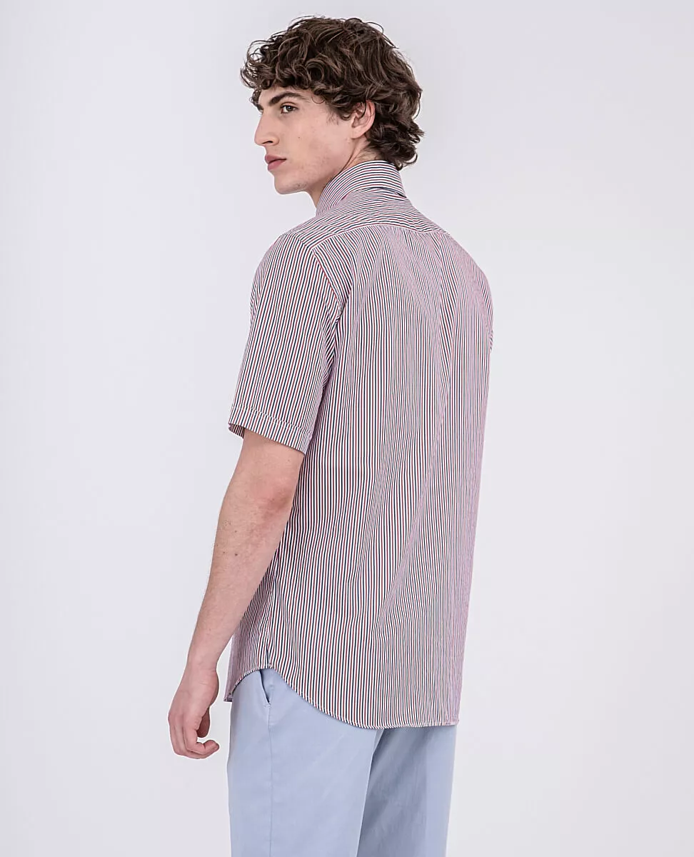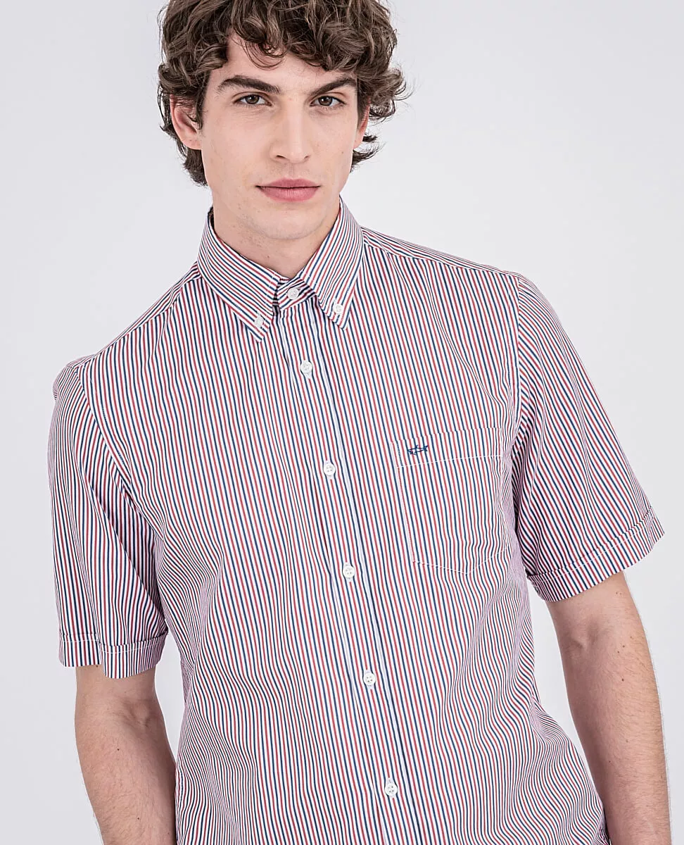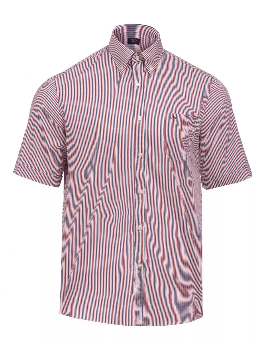 Хлопковая рубашка в полоску с коротким рукавом.Накладкой карман на левой стороне с вышивкой логотипа