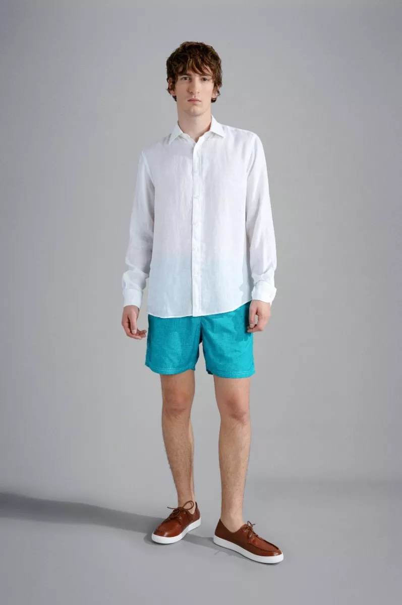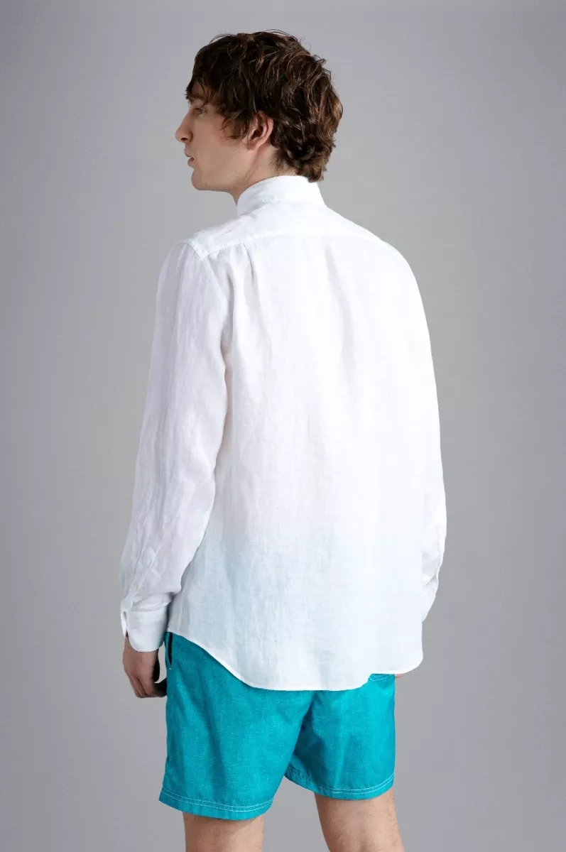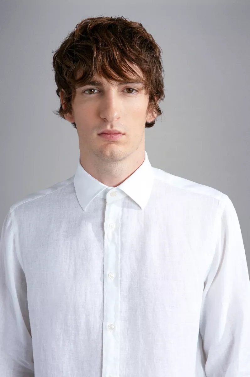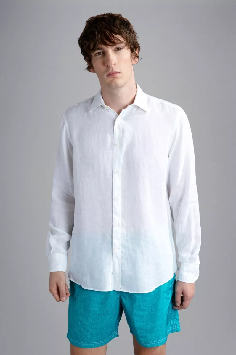 Однотонная льняная рубашка с длинным рукавом, прямым кроем, застёжкой на пуговицы. Материал обладает терморегулирующими свойствами, поэтому модель сохранит ощущение свежести в течение всего дня