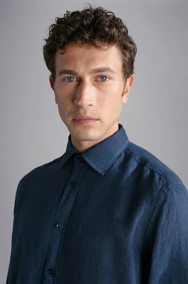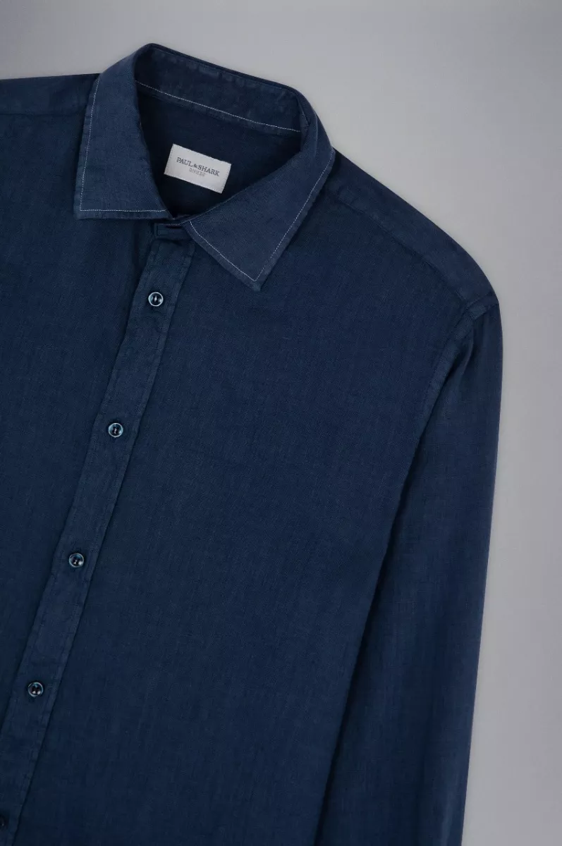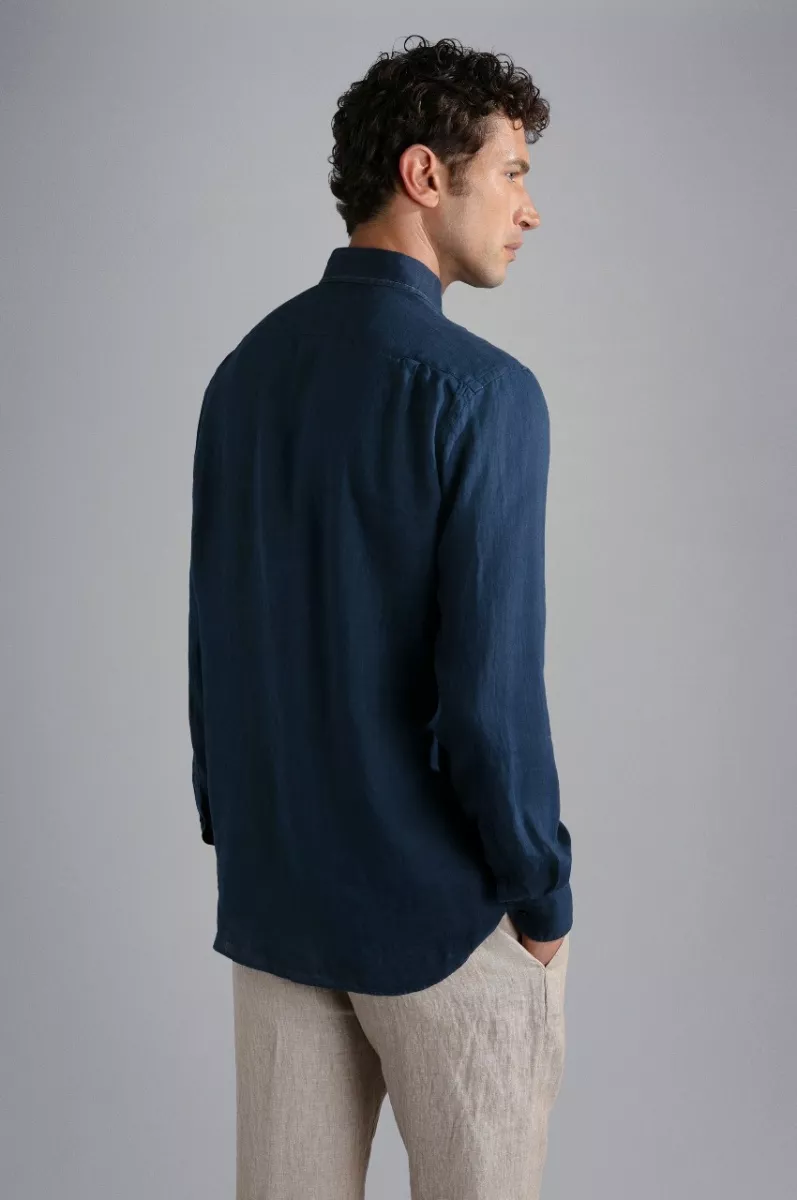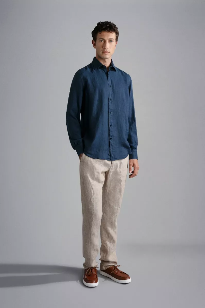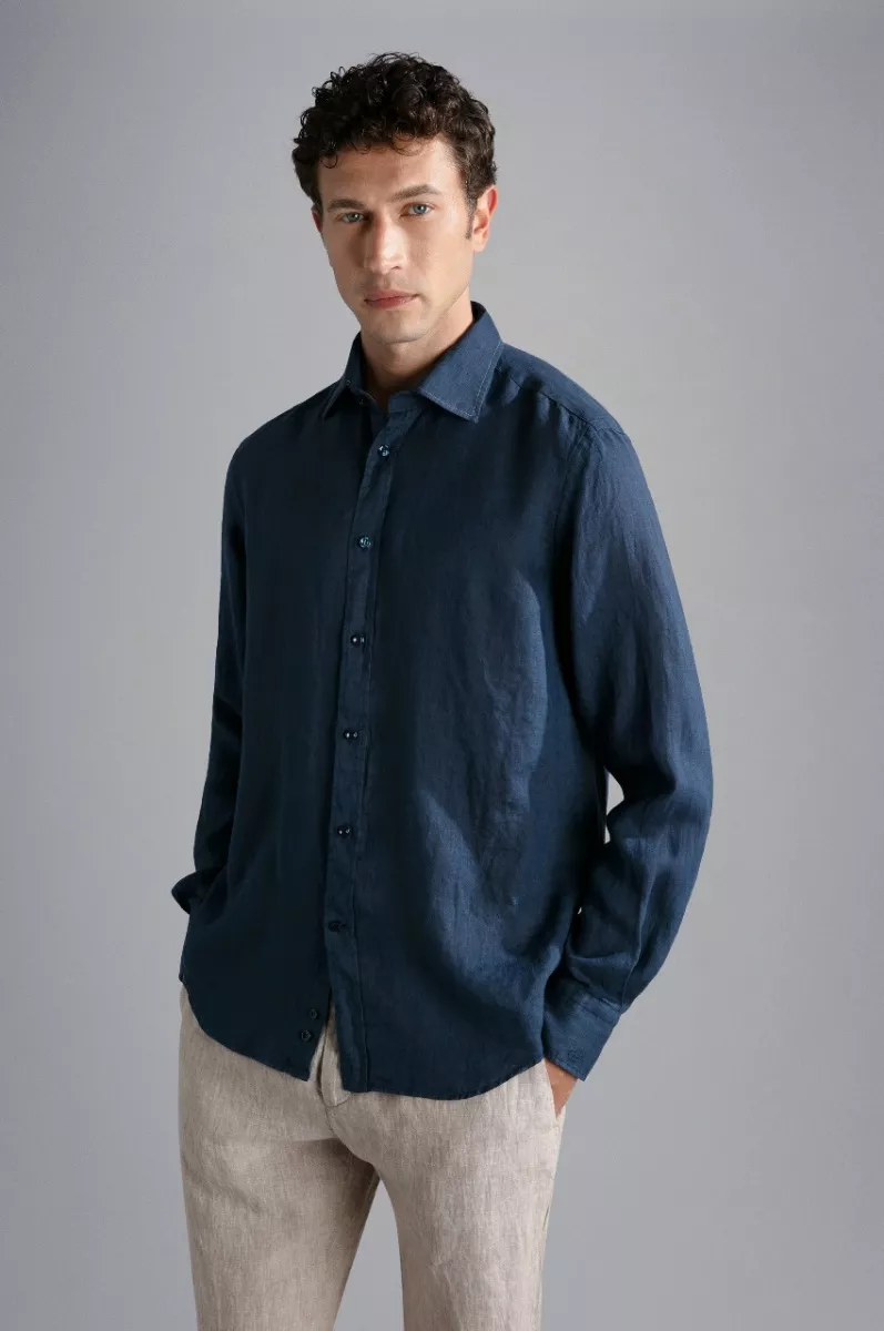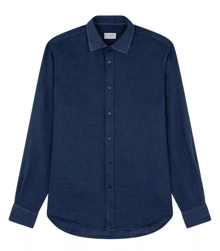 Однотонная льняная рубашка с длинным рукавом, прямым кроем, застёжкой на пуговицы. Материал обладает терморегулирующими свойствами, поэтому модель сохранит ощущение свежести в течение всего дня