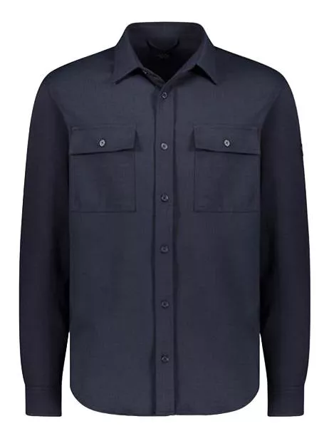 Однотонная рубашка с длинным рукавом. Нашивка с логотипом на рукаве, прямой воротник. Застежка на пуговицах спереди, манжеты на пуговицах. Нагрудные карманы и закругленный подол