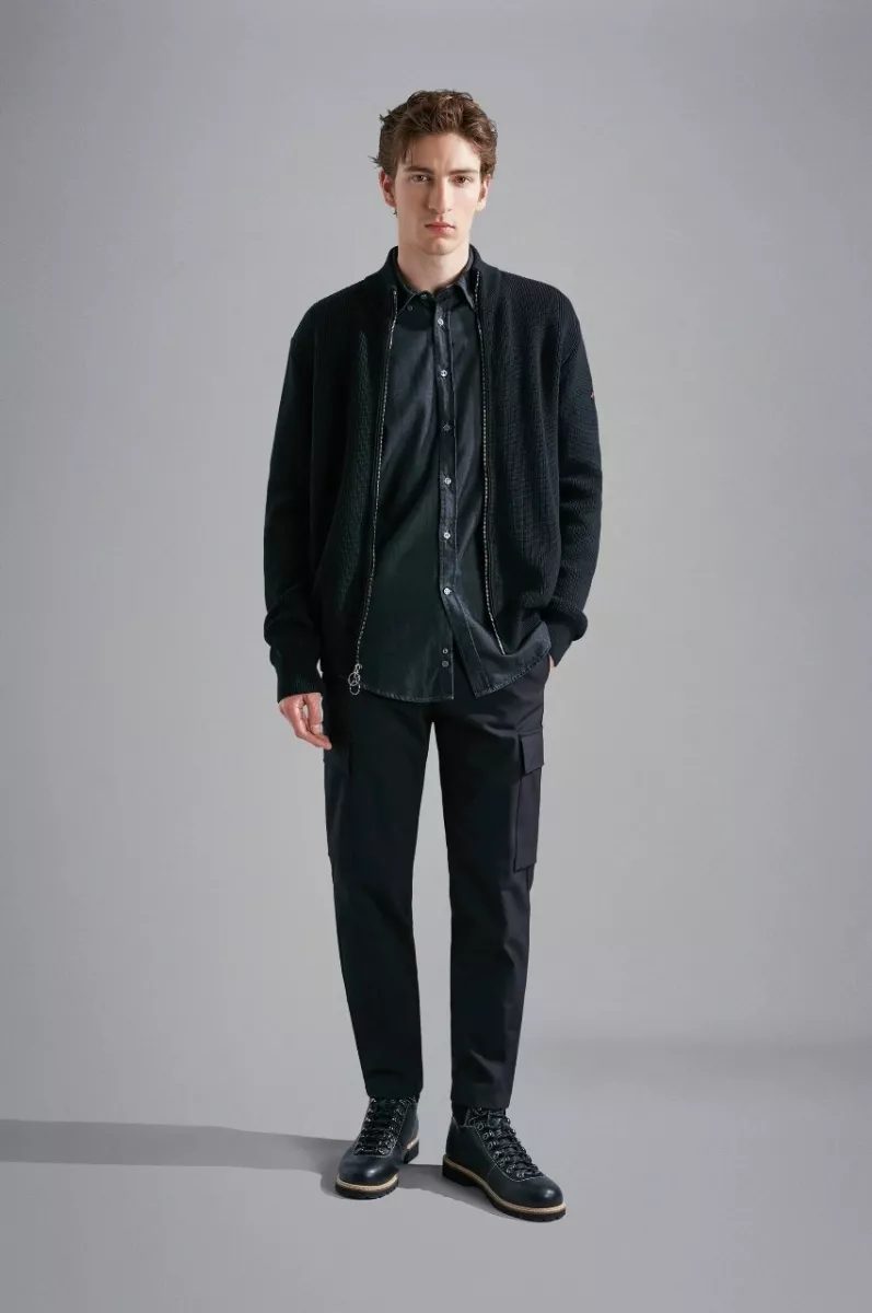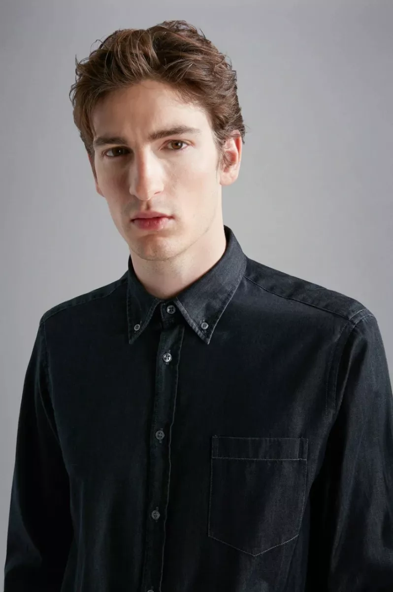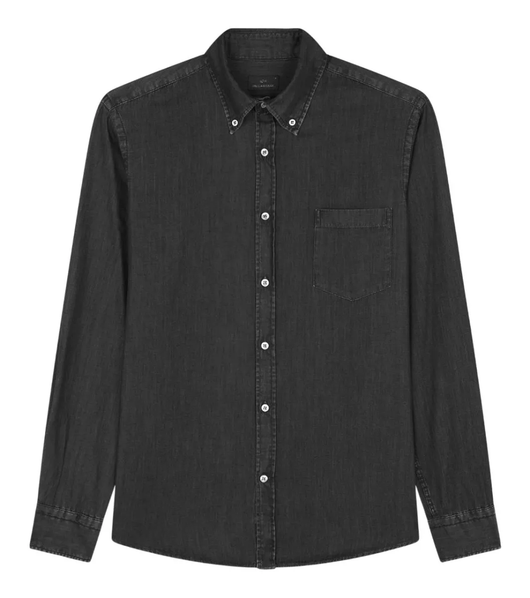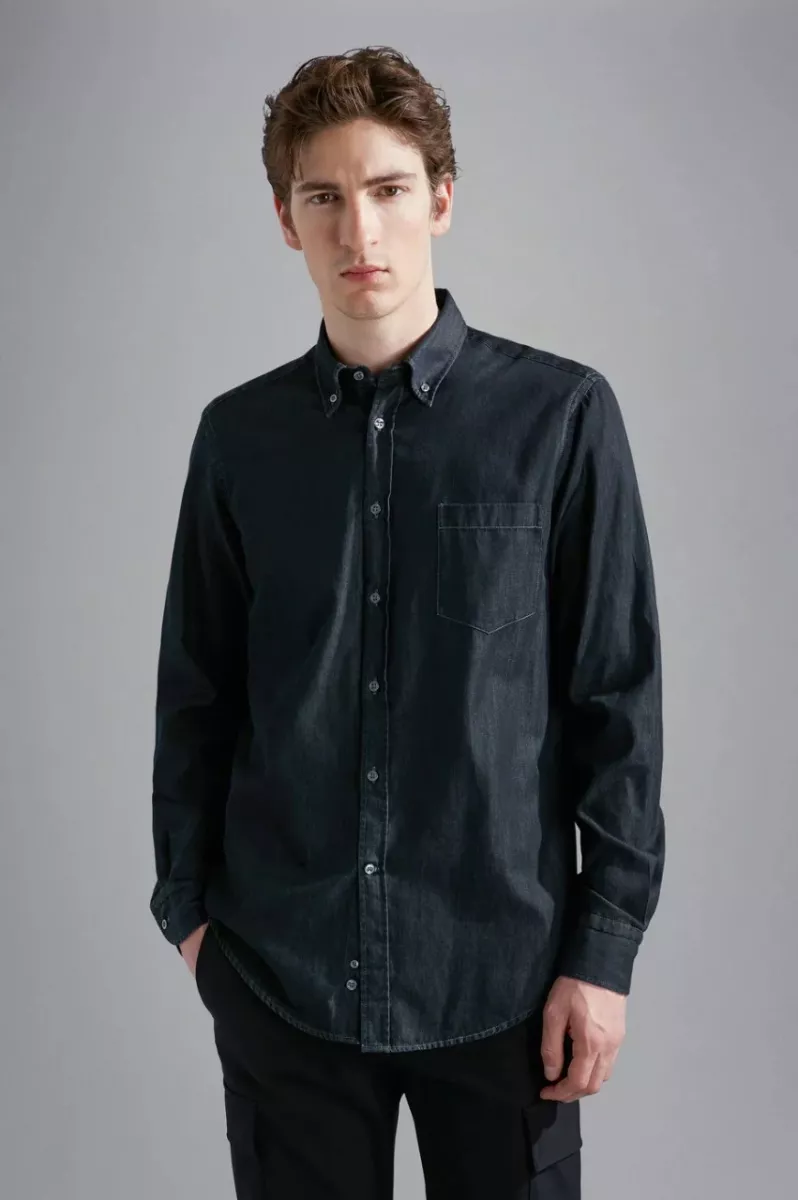 Модель выполнена из Denim no Denim — ткани, которая не теряет цвет и минимизирует потребление воды в производственных циклах. Отличается прямым кроем с округлым низом для безупречной посадки, воротником button down и карманом на груди