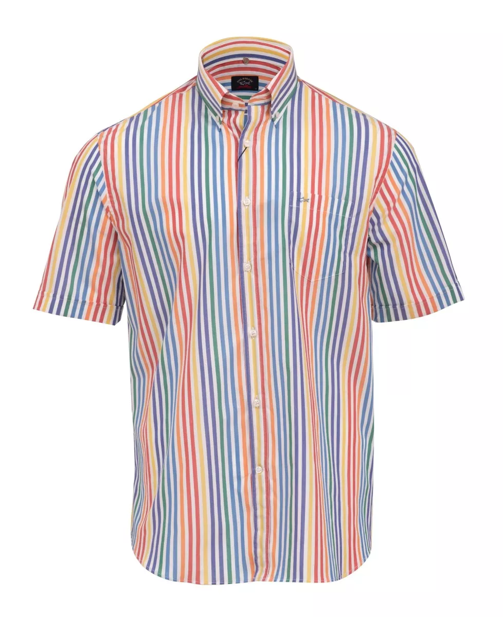 Яркая рубашка в полоску. Отложной воротник "button-down", короткие рукава с манжетами, нагрудный накладной карман с лого, застежка-пуговицы.