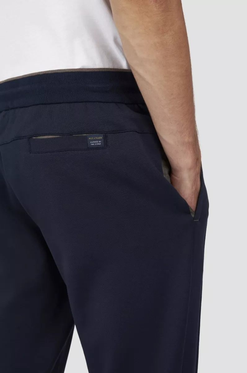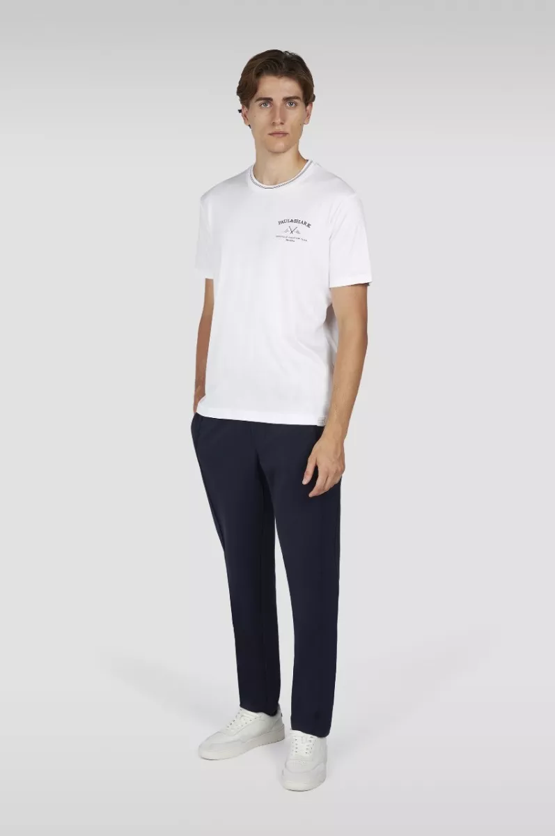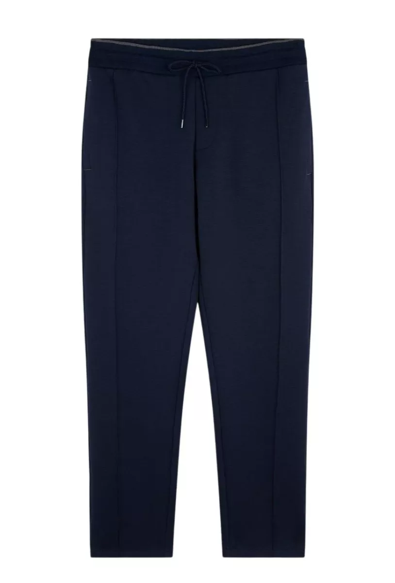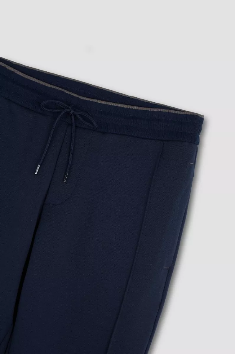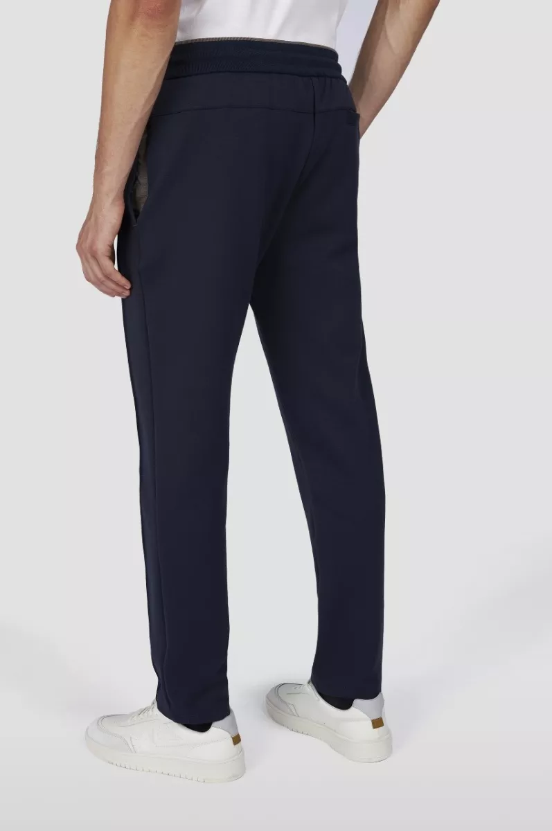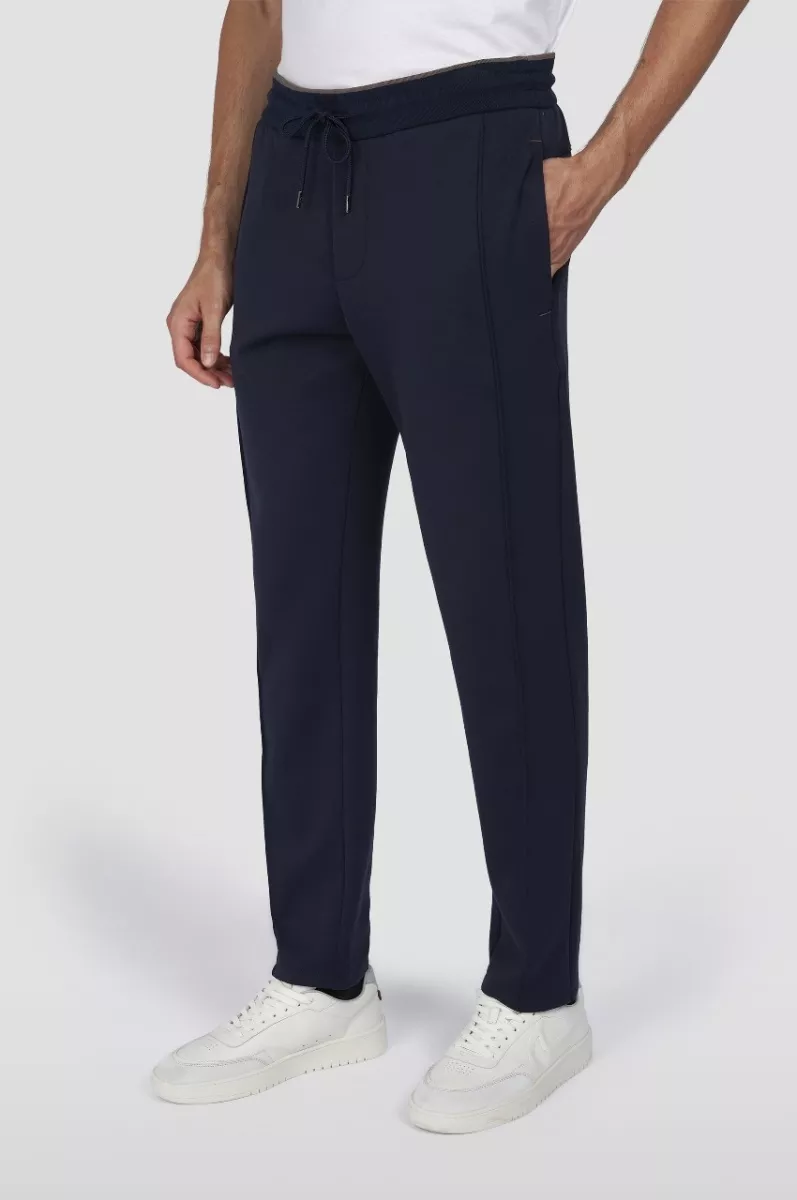 Брюки с простроченными стрелками сшиты из хлопкового трикотажа с добавлением нейлона. Эластичная модель с широким поясом-кулиской дополнена тремя врезными карманами, один из которых украшен фирменным логотипом. Комфортные брюки прямого кроя отлично подойдут для расслабленных повседневных образов