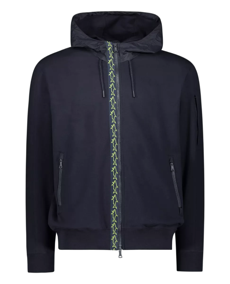 Спортивный костюм из органического хлопка стретч с узором в виде акулы. Верх: толстовка на молнии с капюшоном, 2 боковых кармана на молнии. Низ: спортивные брюки прямого кроя на кулиске. 2 боковых кармана на молнии, один — сзади. Регулирующиеся завязки внизу изделия