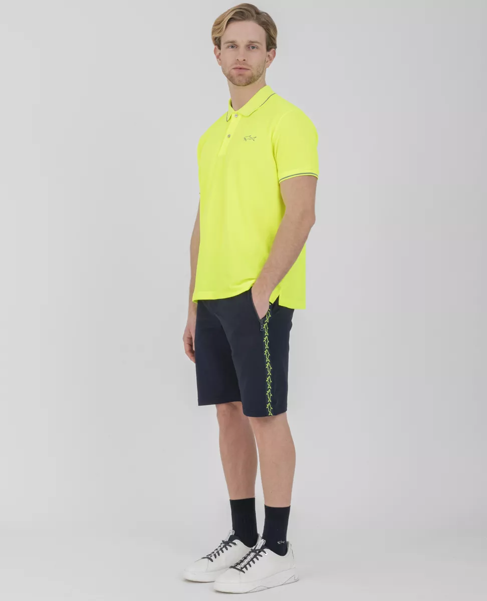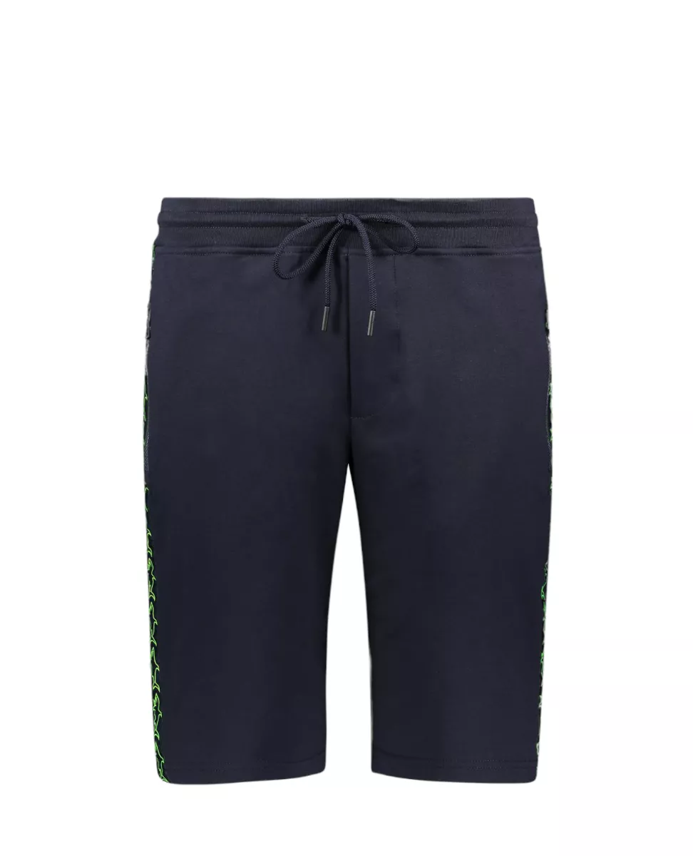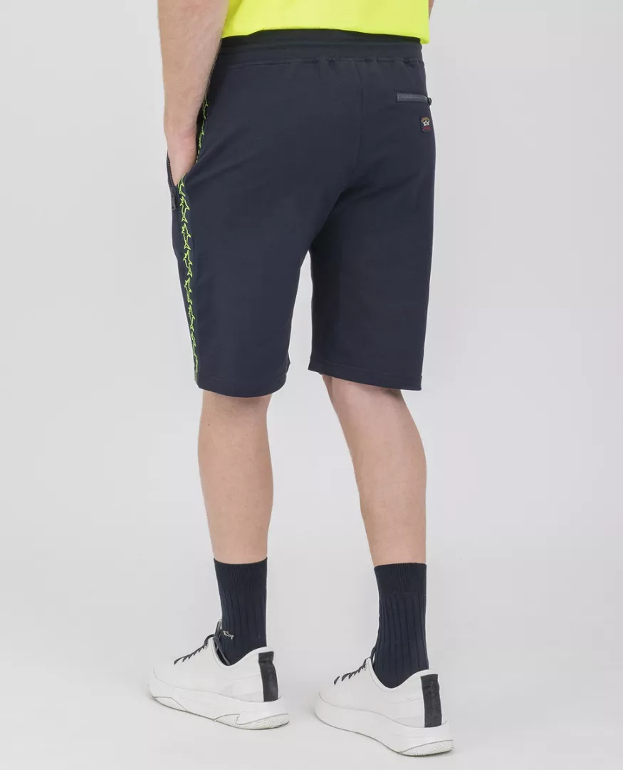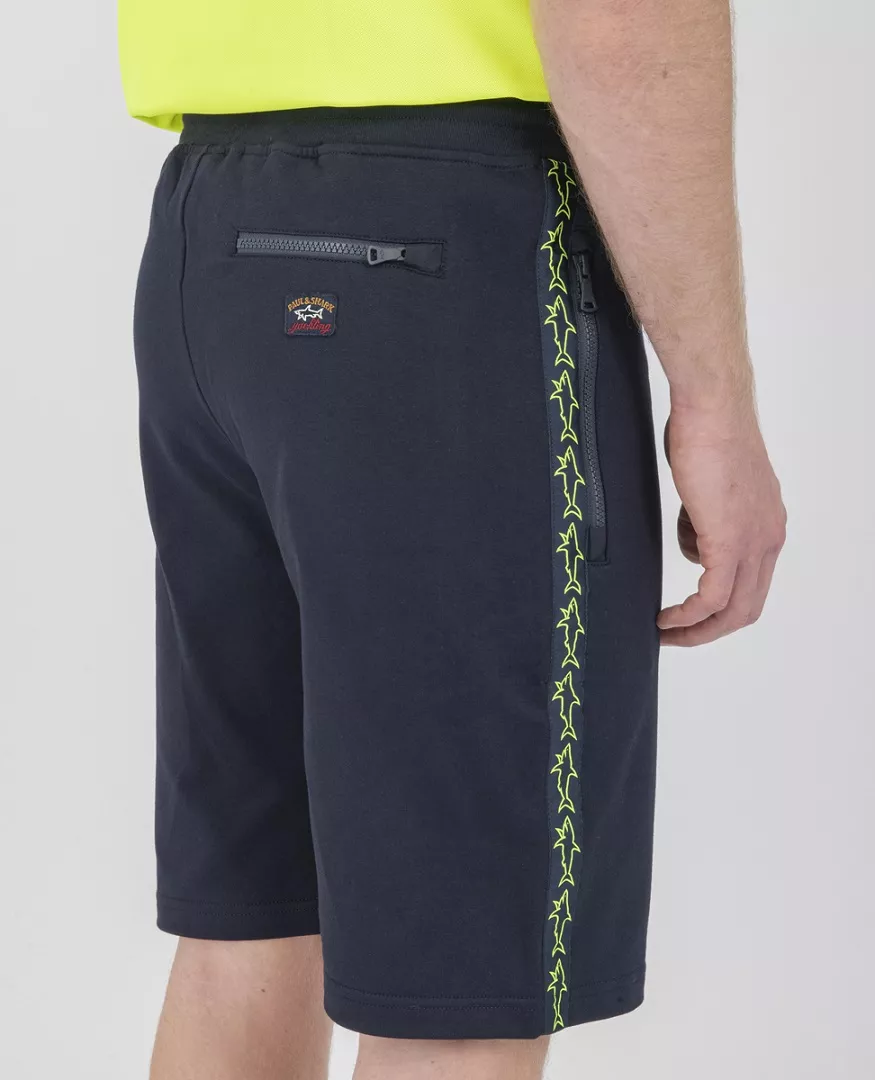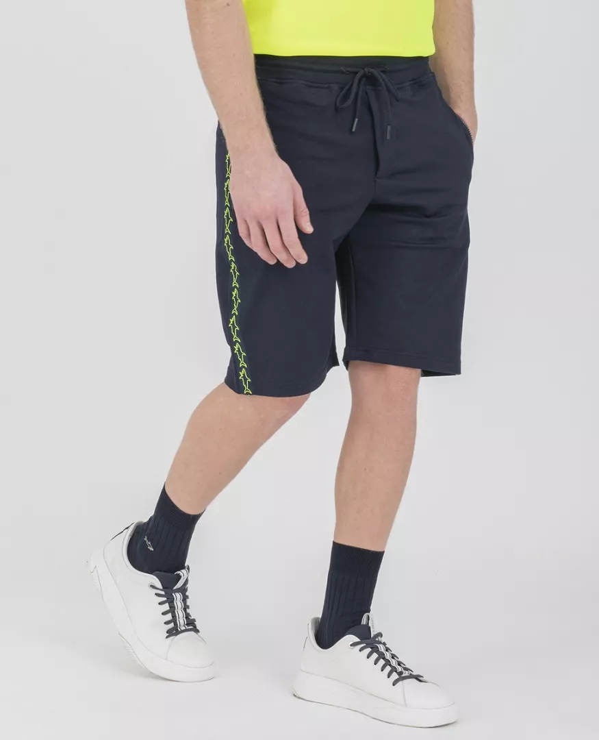 Шорты-бермуды из органического хлопка стретч с лентой с узором в виде акулы. Стильная модель слегка зауженного кроя с эластичной талией на кулиске, боковыми и задним карманом на молнии. Изделие выполнено из натурального эластичного хлопка