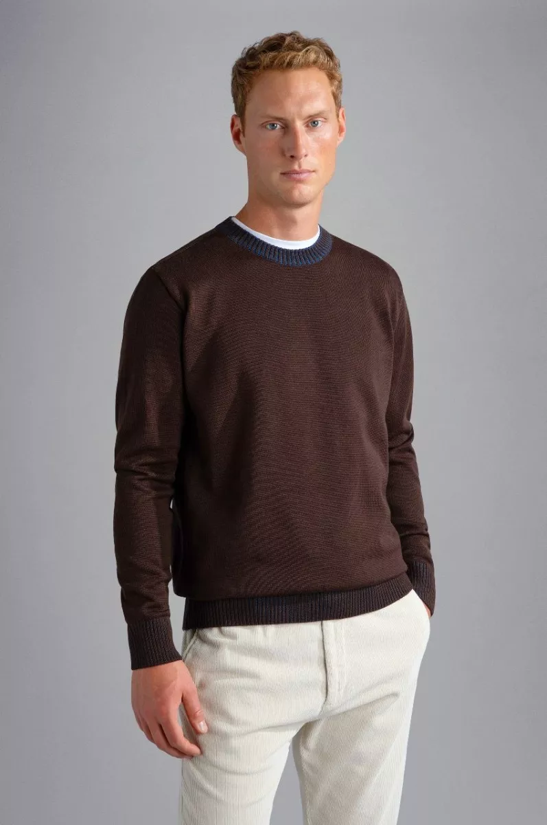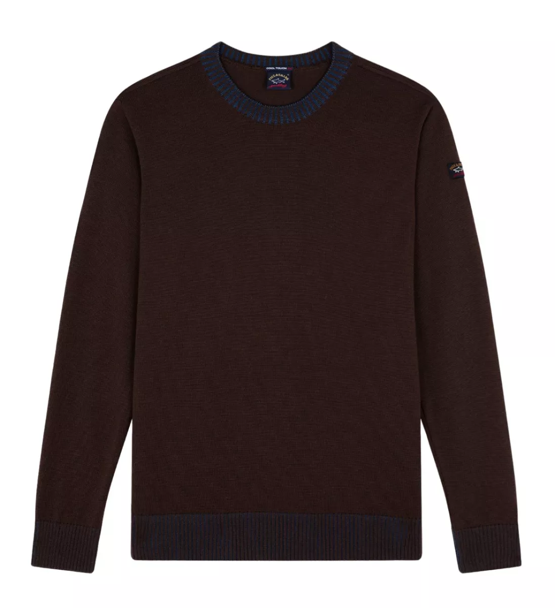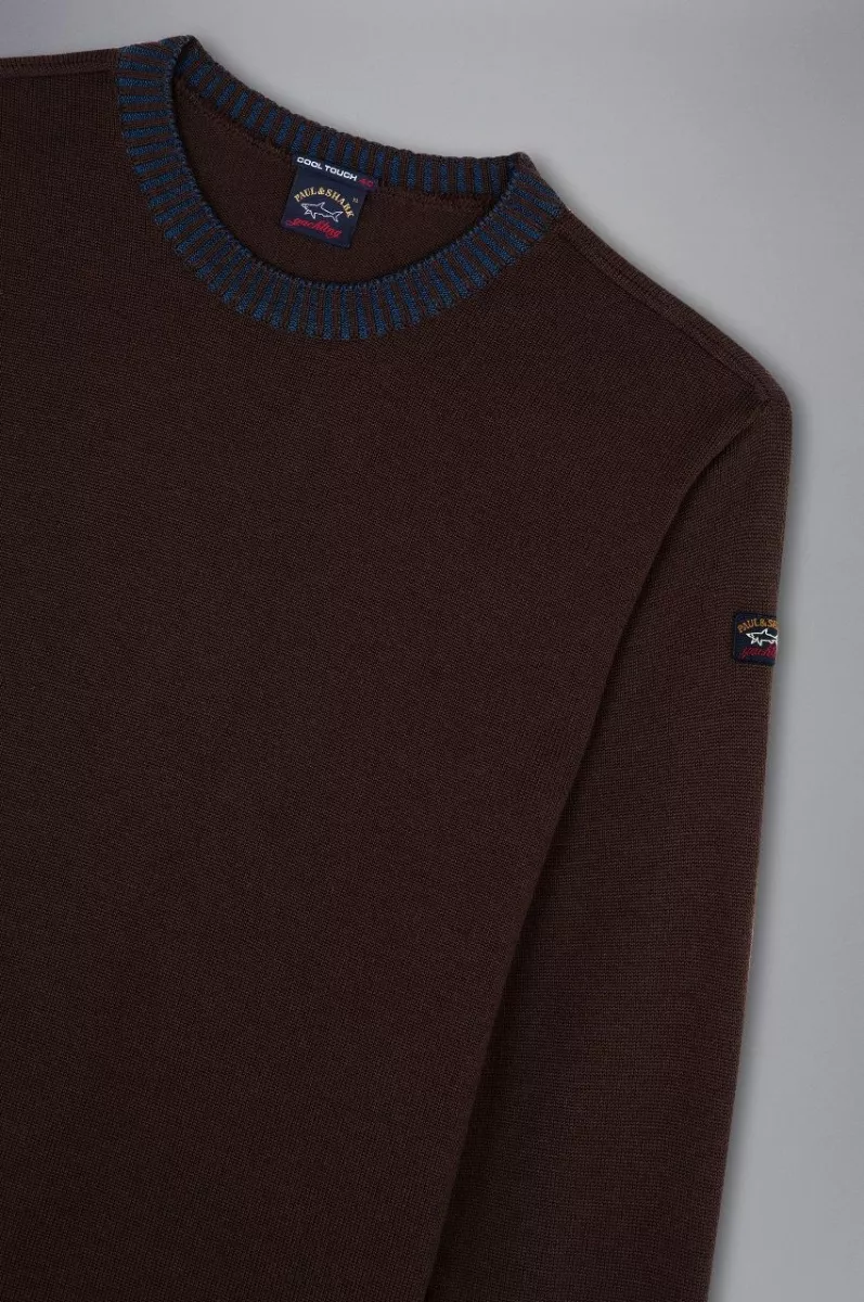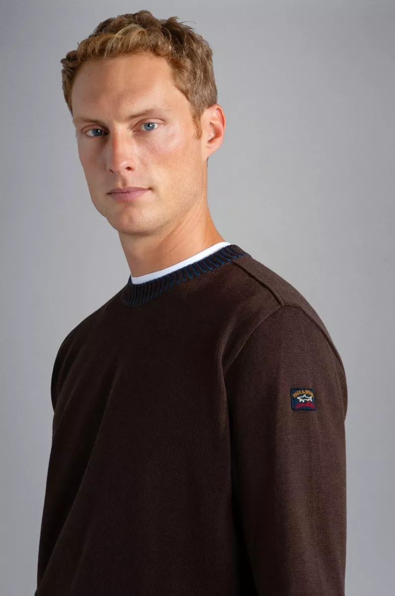 Свитер с круглым вырезом, длинными рукавами, из шерсти. Воротник выполнен из крупной рифлёной вязки, манжеты и низ в рубчик. На левом рукаве нашивка с логотипом