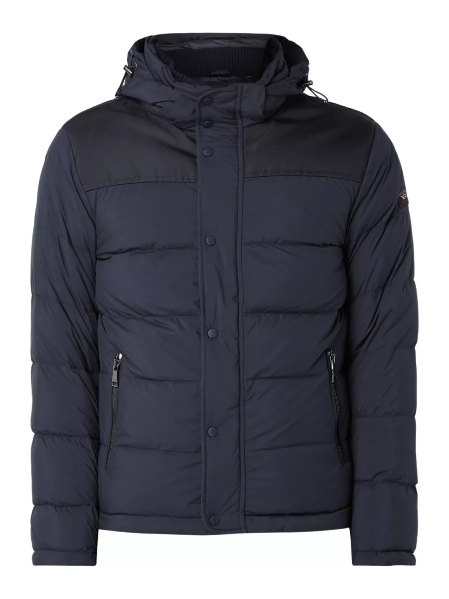 Стёганая куртка с капюшоном, застежкой на молнии и кнопках, логотипом на левом рукаве. Прямой крой, боковые карманы на молнии