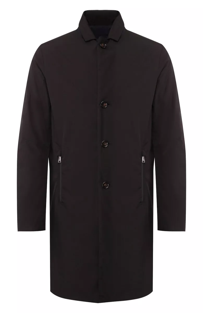 Пальто станет универсальным в базовом гардеробе. Двухстороннее изделие сможет поддержать настроение любого образа: будь то повседневный или деловой. Для пошива одной из частей вещи использовали непромокаемый черный полиэстер, второй — тёмно-синий со стёганым узором. Модель из коллекции сезона осень-зима застёгивается на пуговицы