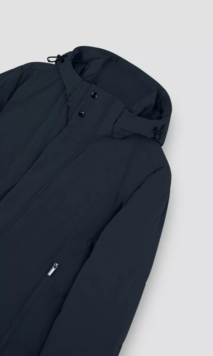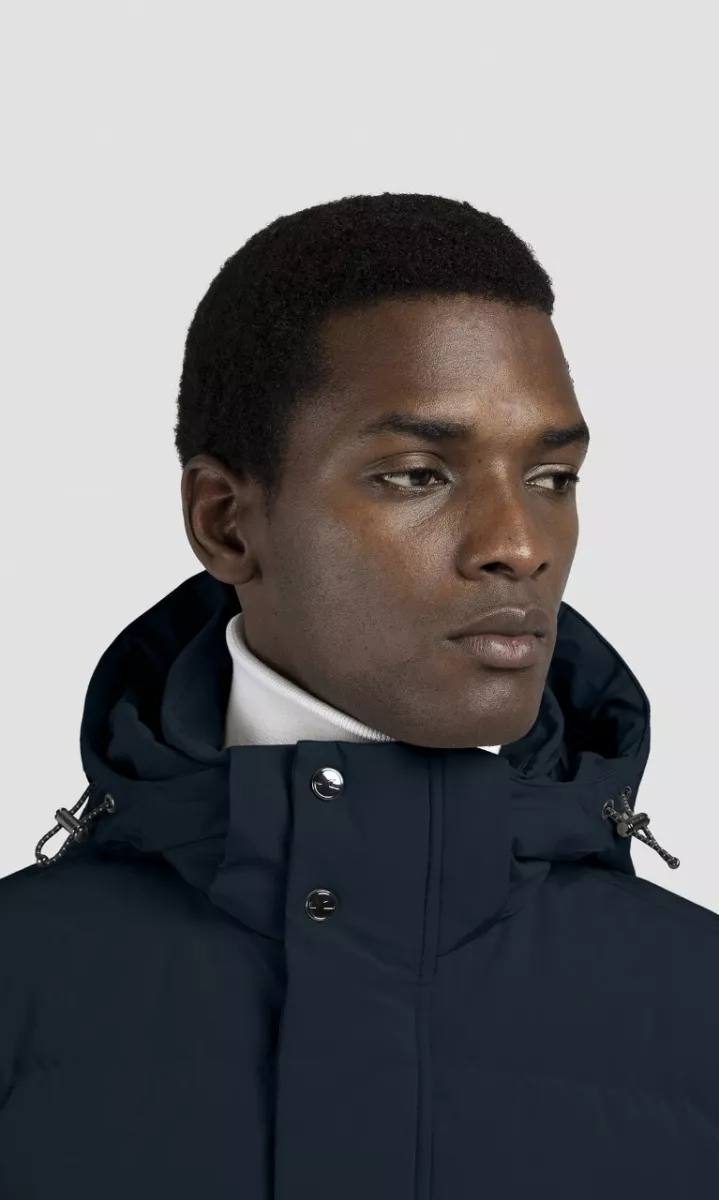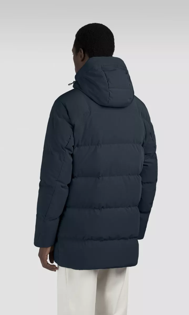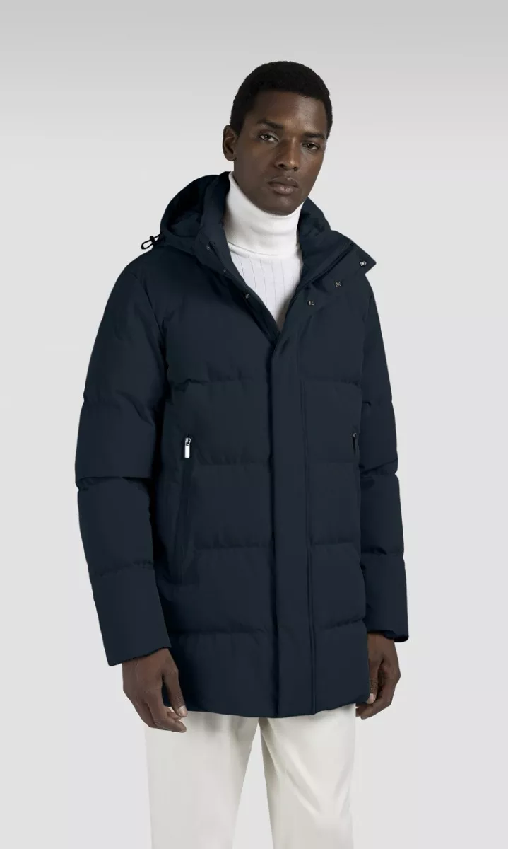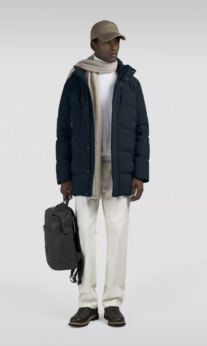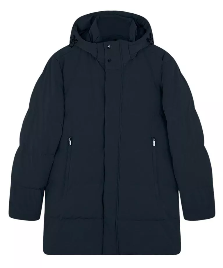 Пуховое пальто выполнено из функционального эластичного материала Typhoon Re-4X4 Stretch с защитой от воды и ветра. Наполнитель из натурального пуха и перьев. Дополнена воротником-стойкой со съемным капюшоном, боковыми карманами на молнии и внутренним карманом с защитой от электромагнитного излучения. Лаконичный логотип добавляет фирменный акцент