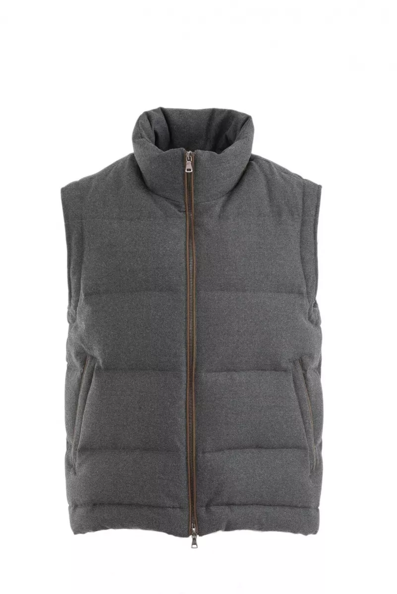 Утепленный шерстяной жилет c врезными карманами по бокам. На воротнике-стойке — контрастная нетекстильная вставка