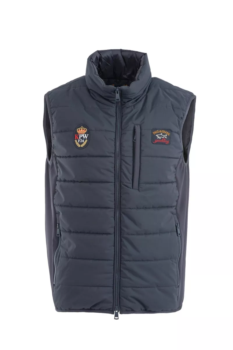Утепленный жилет из коллекции Kipawa. Воротник-стойка, три прорезных кармана на молнии, застежка-молния, текстильные нашивки в стиле бренда.